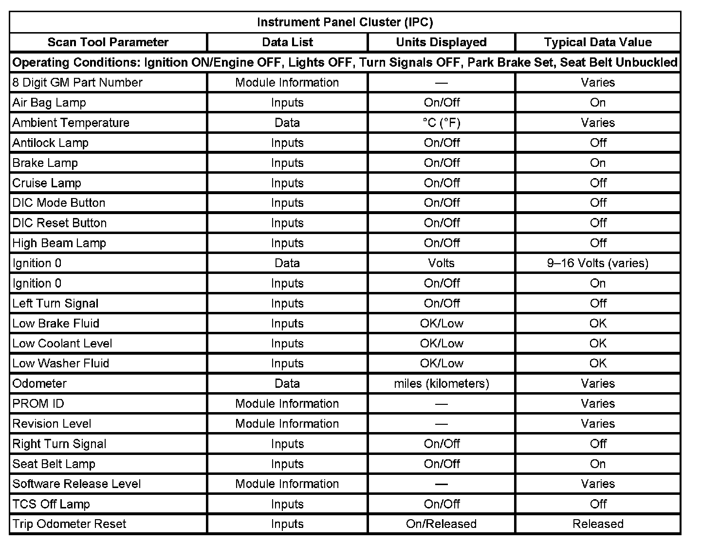 Scan Tool Data List - Instrument Panel Cluster (IPC)