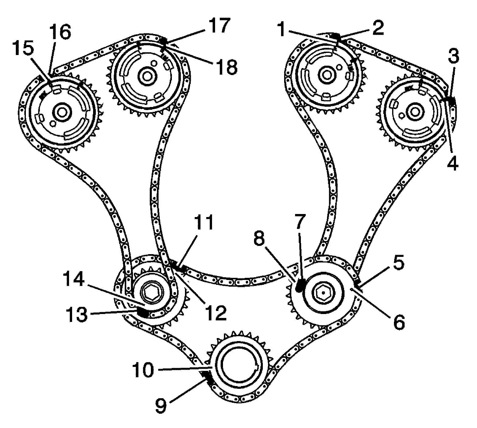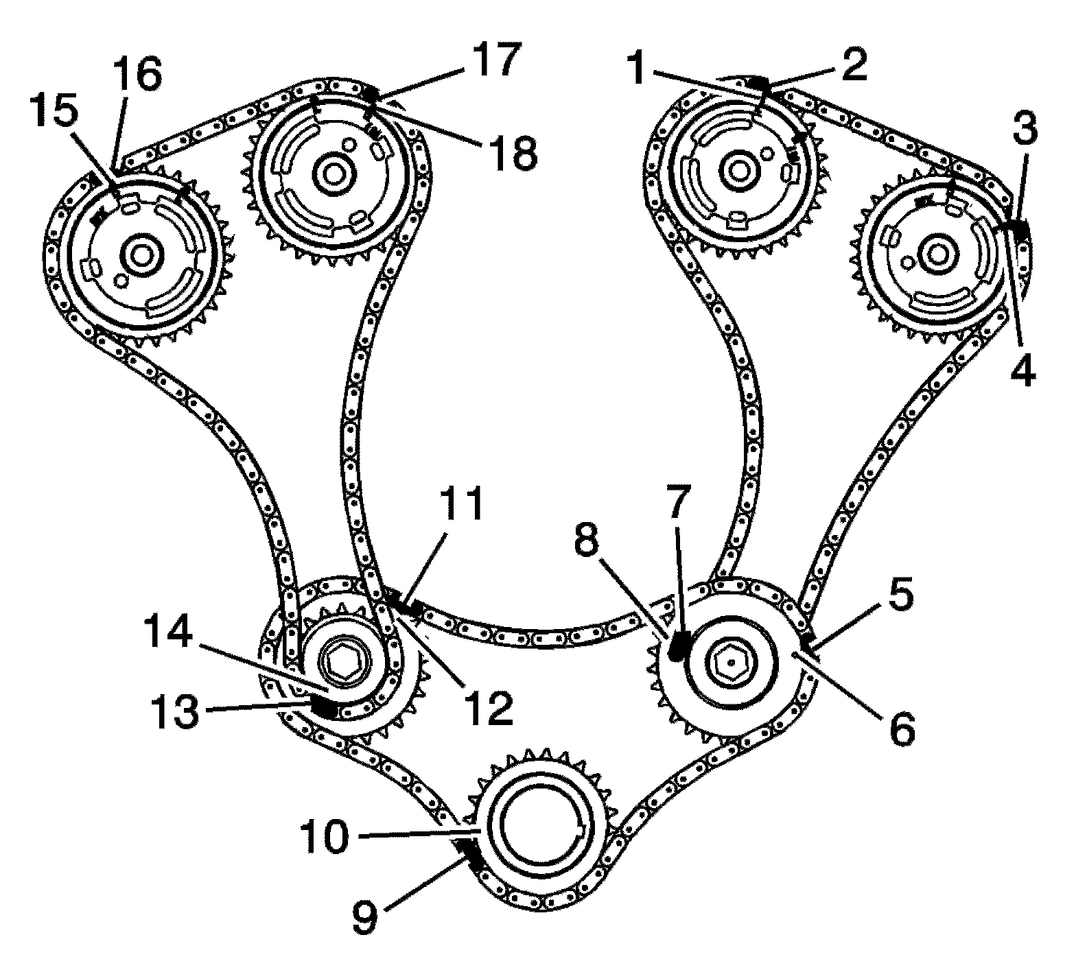 8. Mark the timing chain and the respective locations on camshaft position actuators (15-18).