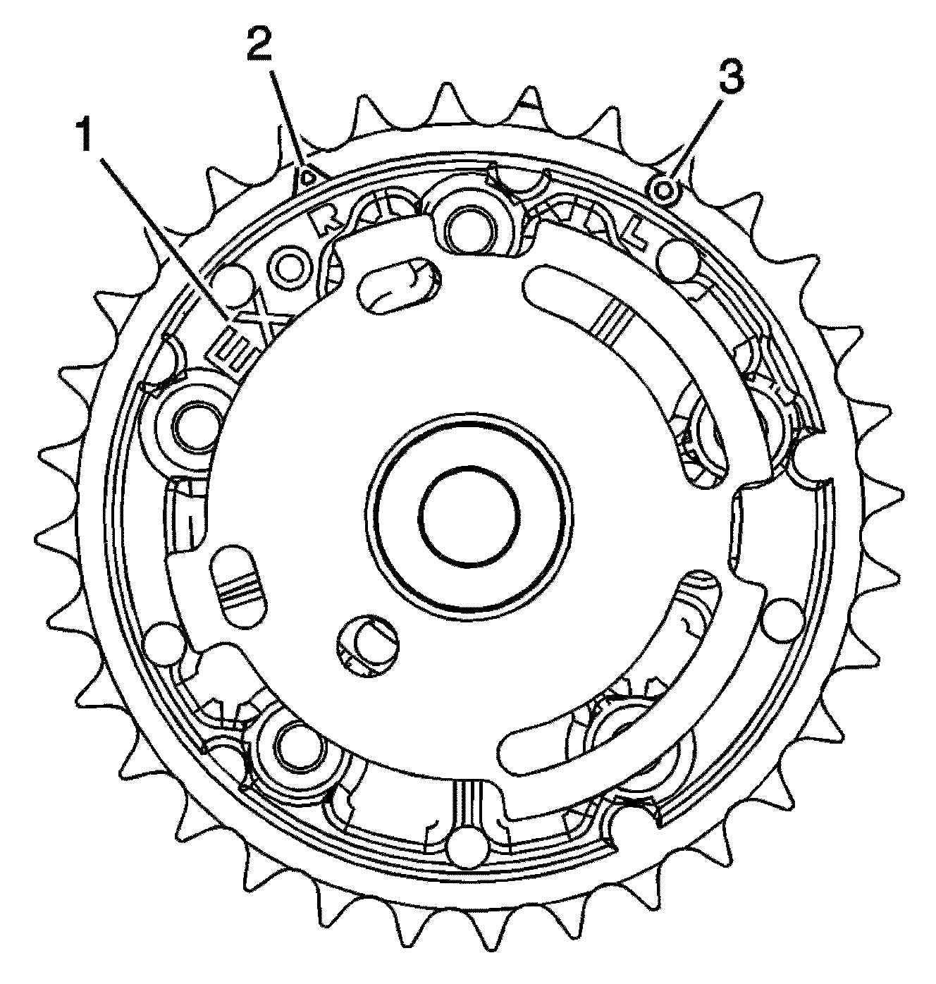 2. Ensure the proper timing mark is used. Observe the outer ring of the camshaft position actuator for the R and triangle marking (2). The marking is for alignment to the highlighted timing chain link on the right side of the engine.
