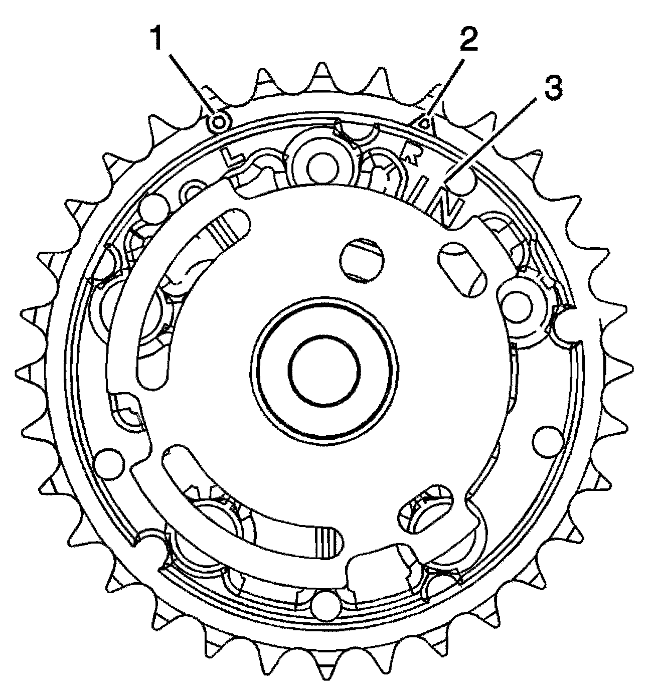 1. Ensure the proper camshaft position actuator is installed. Observe the body of the camshaft position actuator for the IN marking (3). The marking is for the intake camshaft position actuator.