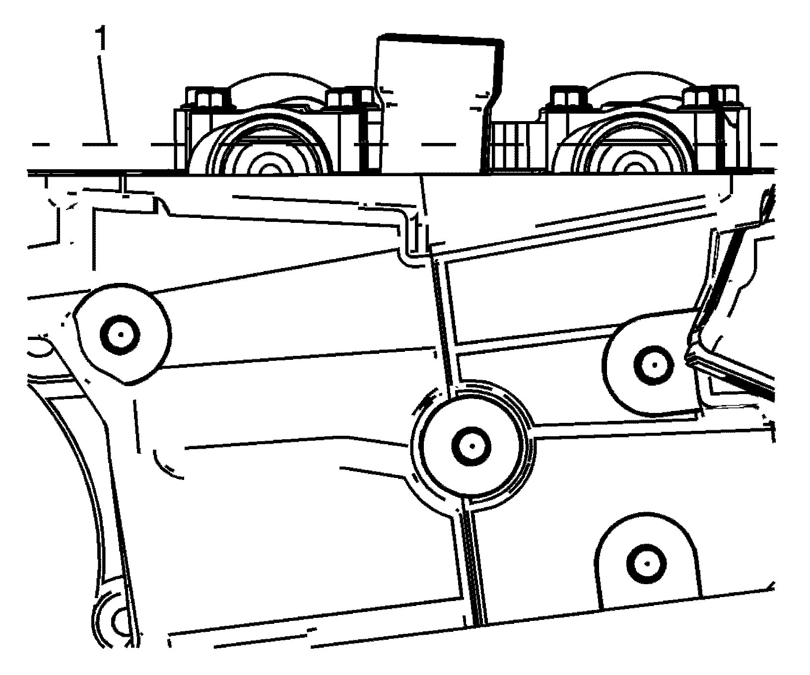 5. Rotate the crankshaft using the crankshaft balancer bolt until the camshafts are in a neutral (low tension) position. The camshaft flats will be parallel with the camshaft cover rail (1).