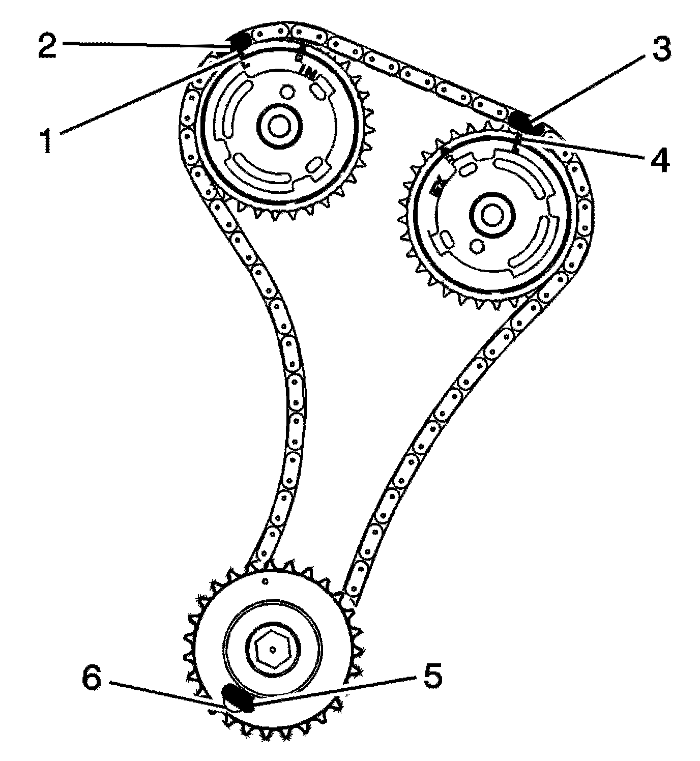 8. Mark the timing chain and the respective locations on the camshaft position actuators (1-4).