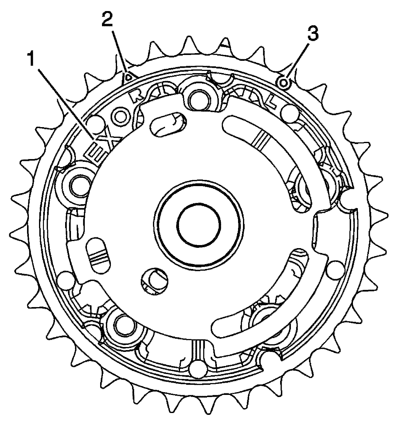 2. Ensure the proper timing mark is used. Observe the outer ring of the camshaft position actuator for the L and circle marking (3). The marking is for alignment to the highlighted timing chain link on the left side of the engine.