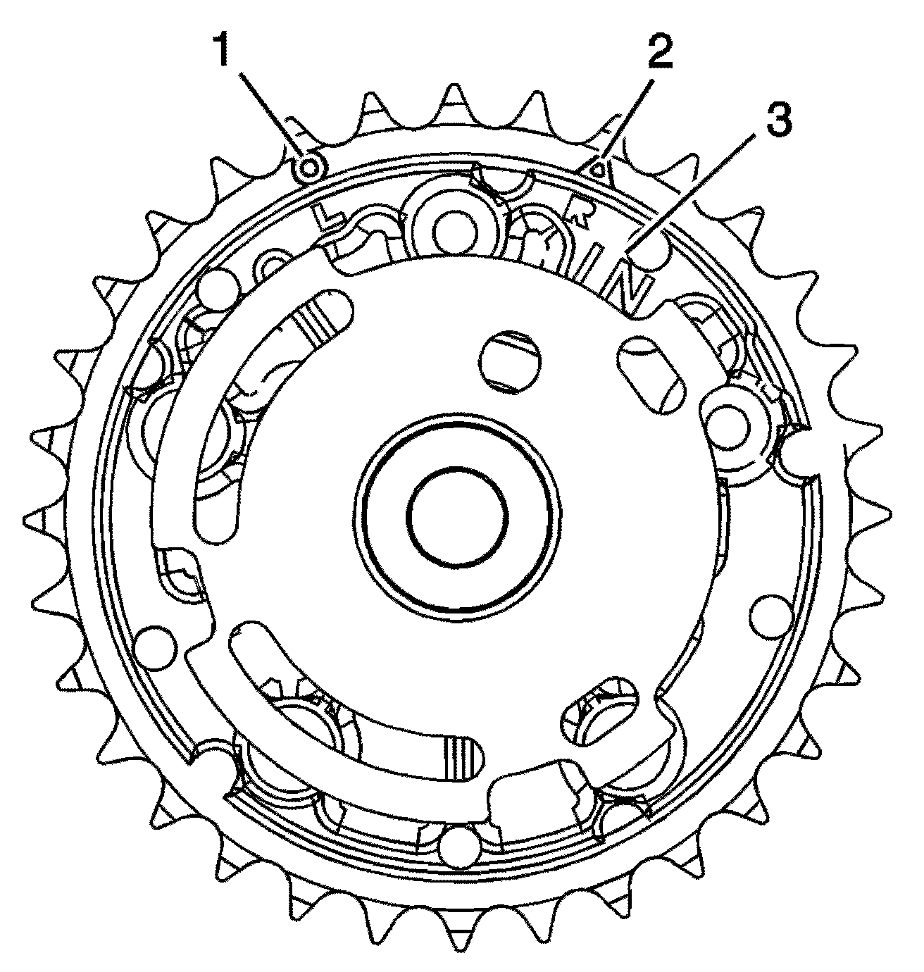 2. Ensure the proper timing mark is used. Observe the outer ring of the camshaft position actuator for the L and circle marking (1). The marking is for the alignment to the highlighted timing chain link on the left side of the engine.