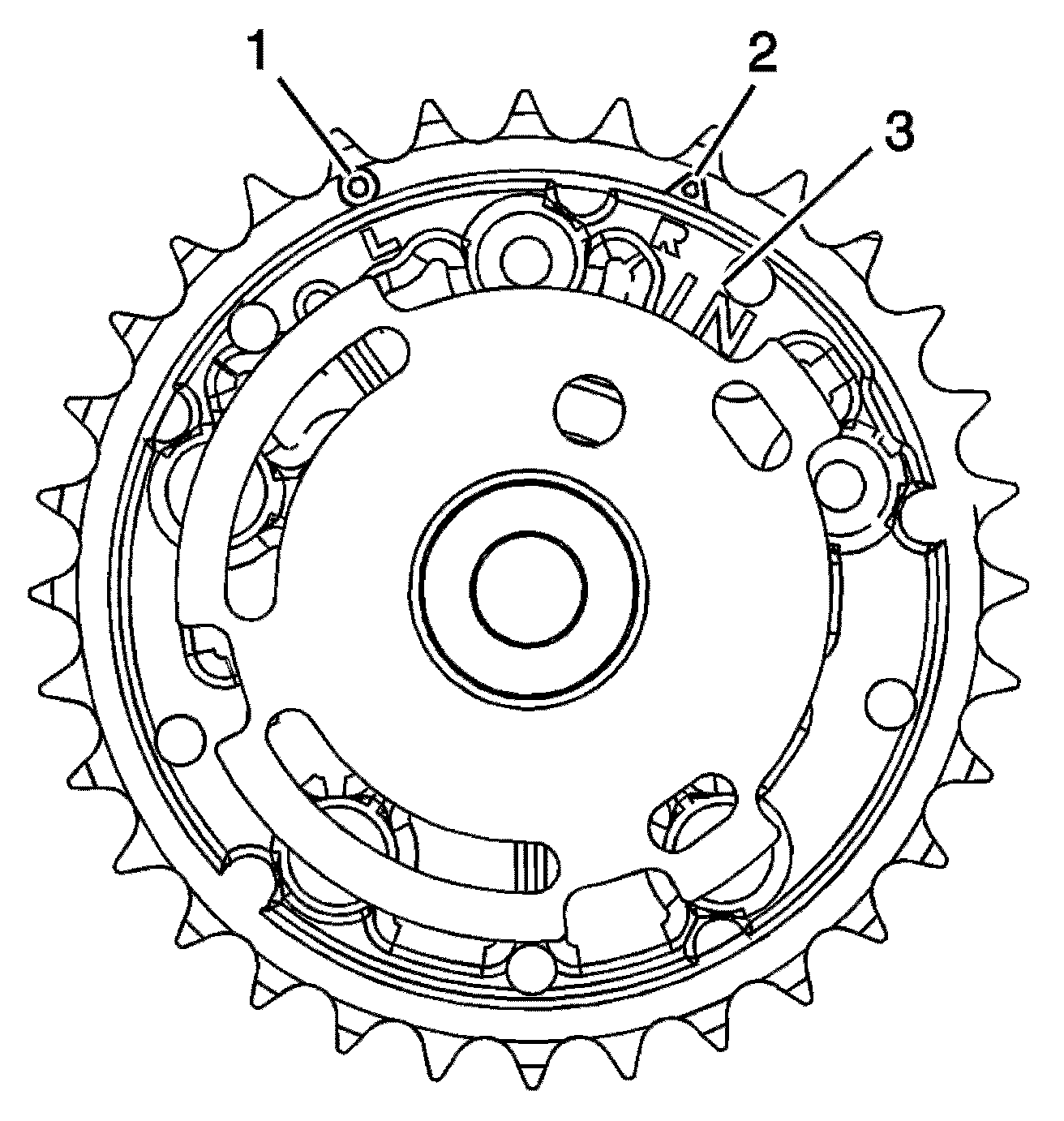 2. Ensure the proper timing mark is used. Observe the outer ring of the camshaft position actuator for the L and circle marking (1). The marking is for alignment to the highlighted timing chain link on the left side of the engine.