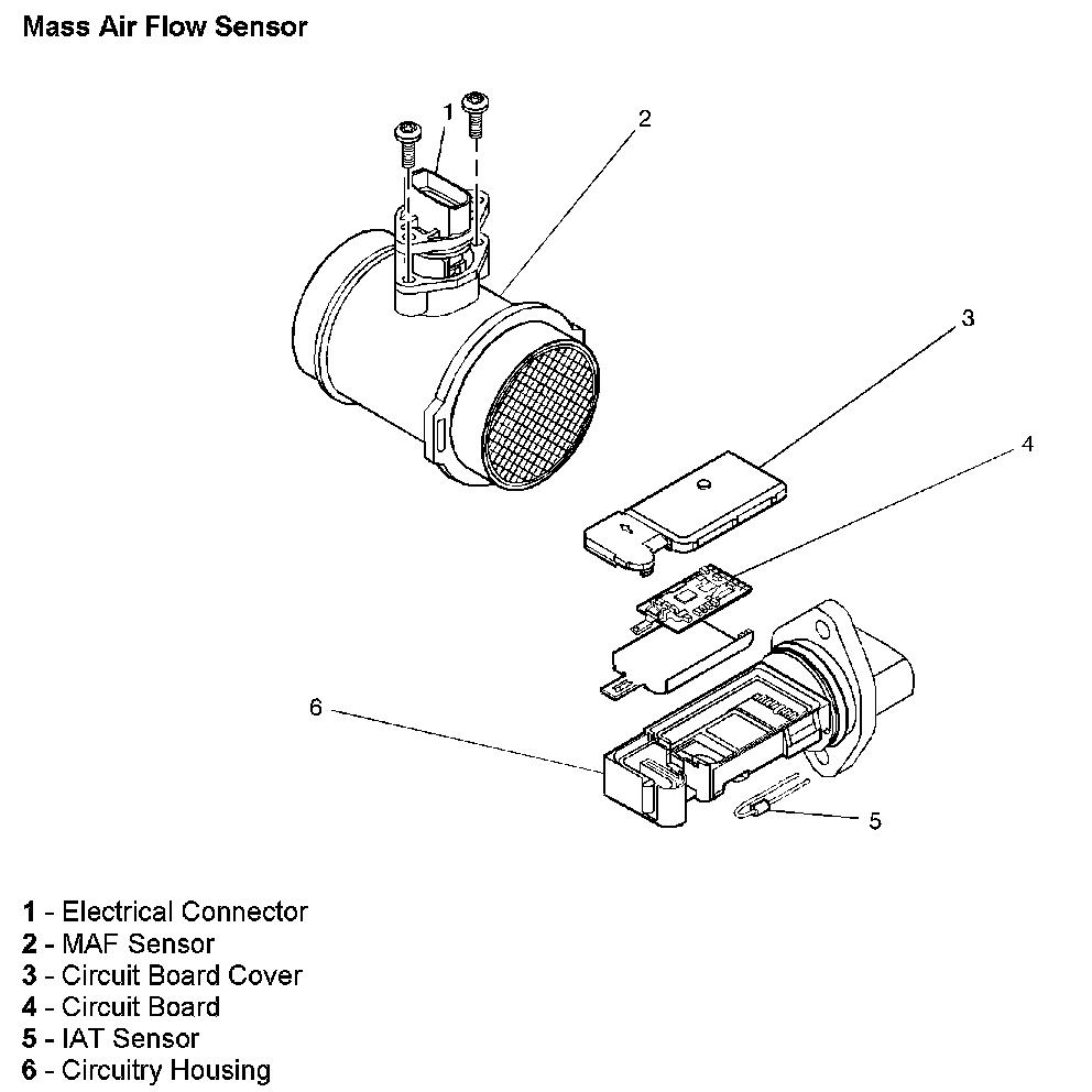 The MAF sensor measures the amount of air coming into the engine. This direct airflow measurement is more accurate than the calculated airflow information obtained from the other sensor inputs. The MAF sensor also houses an integrated intake air temperature (IAT) sensor. The MAF sensor uses the following circuits: