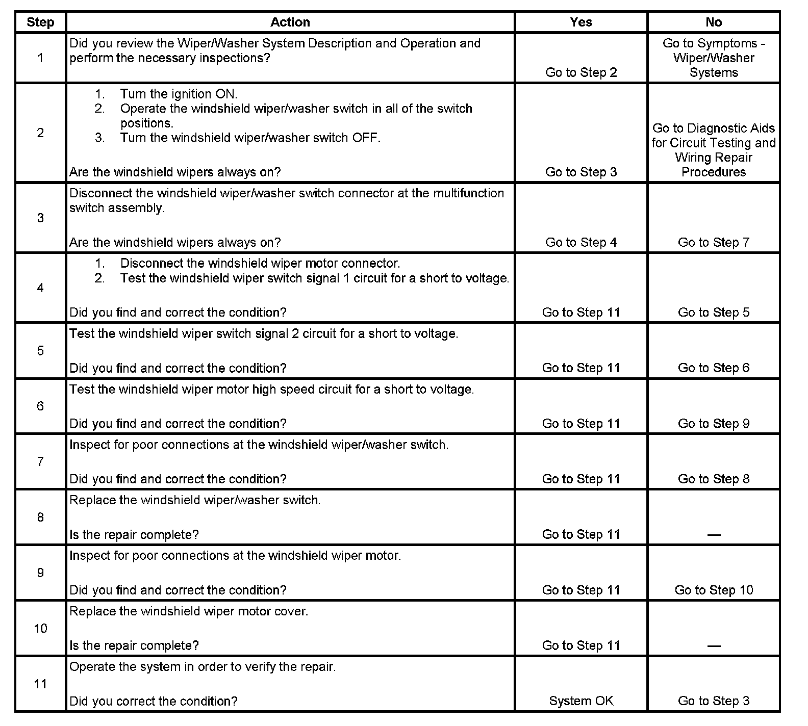Tests for an internal fault in the windshield wiper/washer switch.