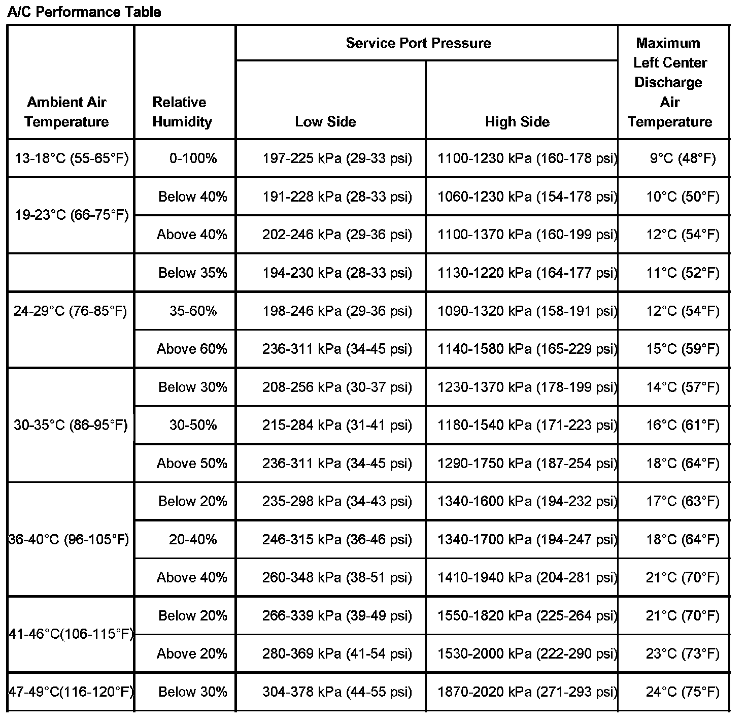 A/C Performation Table: