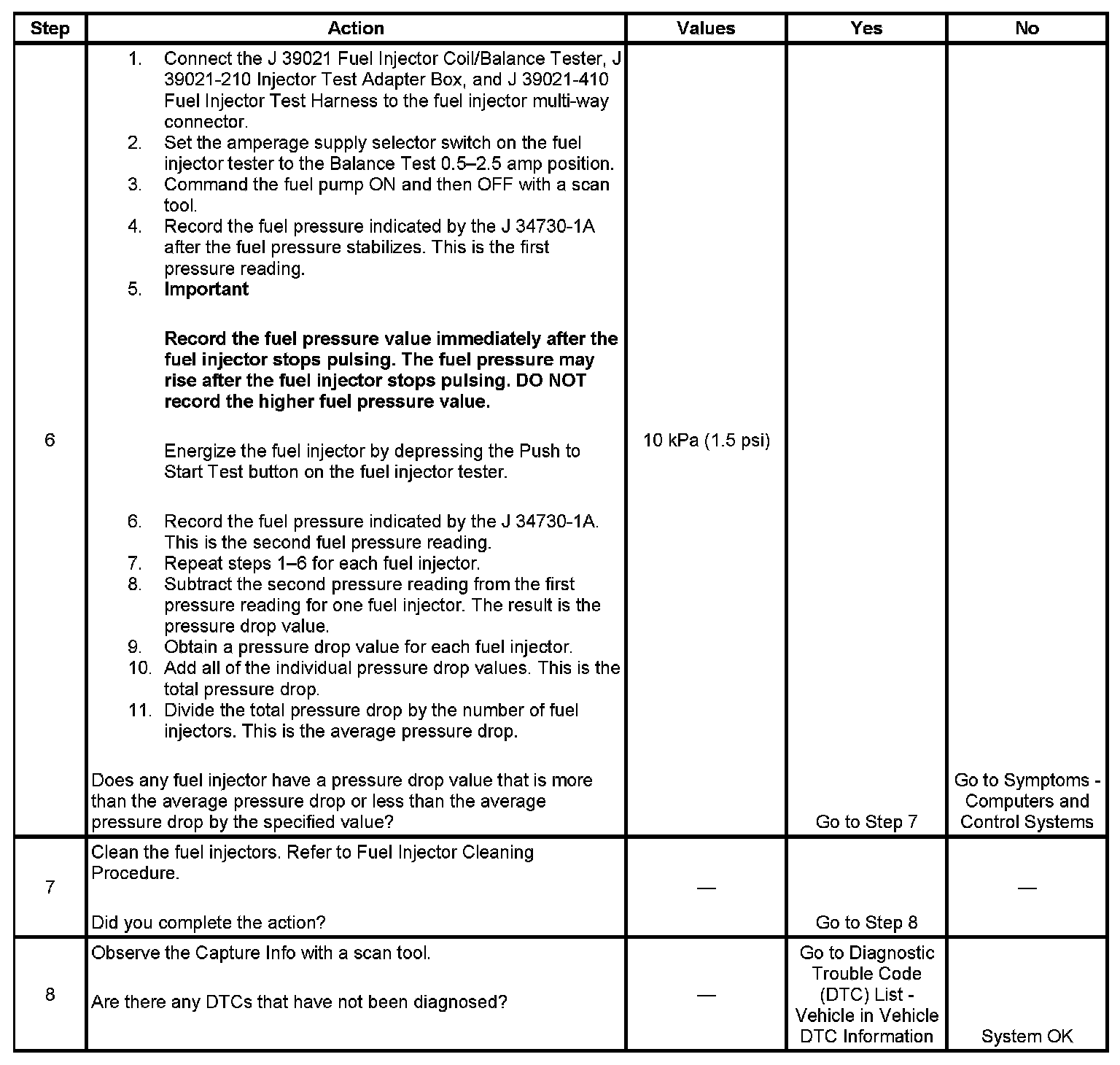6. If the pressure drop value for each fuel injector is within 10 kPa (1.5 psi) of the average pressure drop value, the fuel injectors are flowing properly.