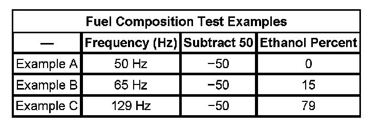 3. Subtract 50 from the reading on the DMM in order to obtain the percentage of alcohol in the fuel sample. Refer to the examples in the Fuel Composition Test Examples table.