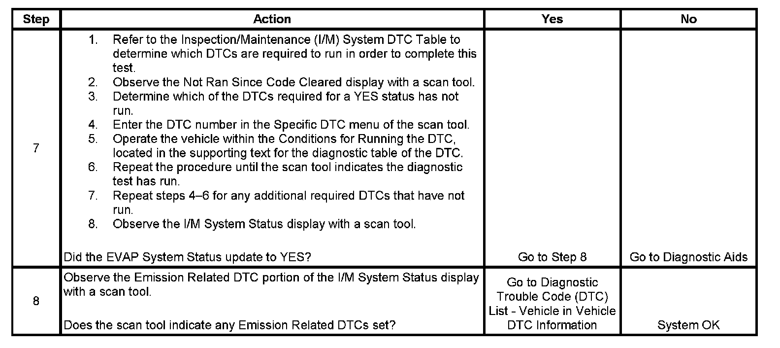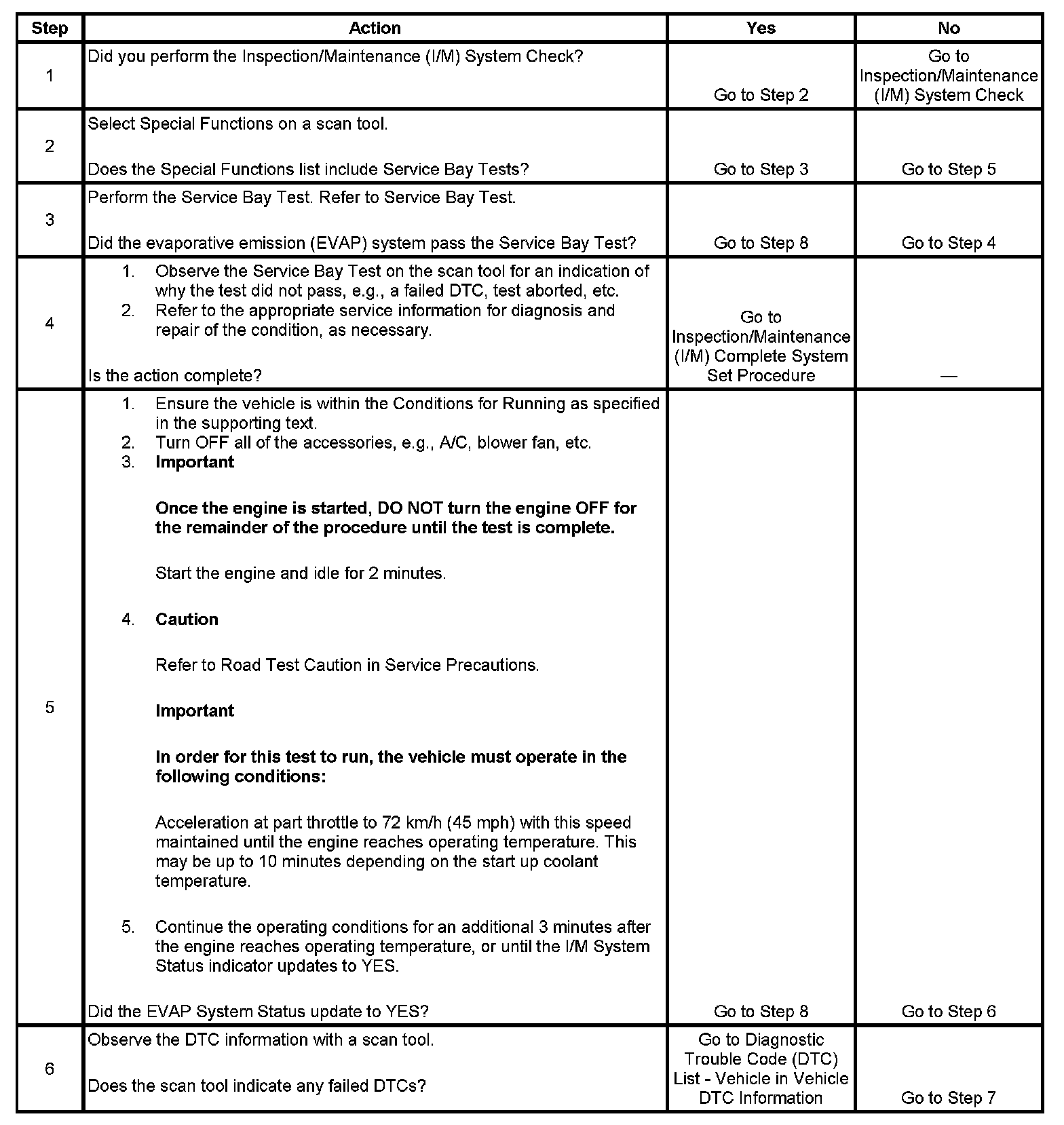 The purpose of this test is to satisfy the enable criteria necessary to execute inspection/maintenance (I/M) readiness diagnostics for the evaporative emission (EVAP) system. The test may be used to set the I/M System Status indicators to YES. The I/M System Status display on the scan tool indicates whether or not the control module has completed the required test. The required test is complete when either all of the DTCs comprising the test have run and passed, or when any one of the DTCs comprising the test has illuminated the malfunction indicator lamp (MIL). Once the test is complete, the I/M System Status display will indicate YES in the completed column. Performing a visual inspection prior to running the EVAP test may prevent having to repeat the test due to the fact that a failed or aborted test will require the vehicle to cool down in order to meet the enable criteria to run another test.