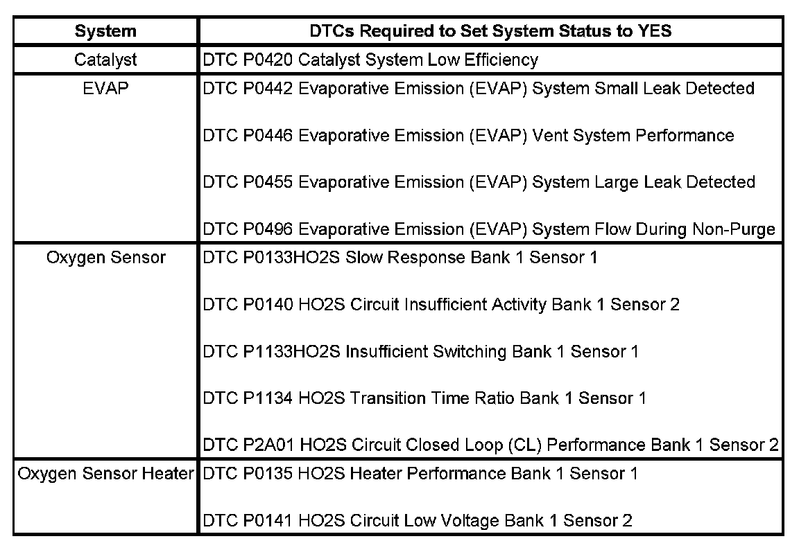 IMPORTANT: Not all vehicles will have every diagnostic trouble code (DTC) listed in each section. For example, a vehicle may have only 2 oxygen sensors or 1 catalyst. Only those DTCs applicable to the vehicle are required to update each System Status to YES. Refer to the appropriate service data to determine which DTCs are supported for each vehicle.