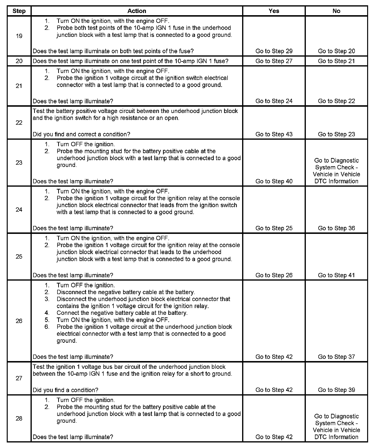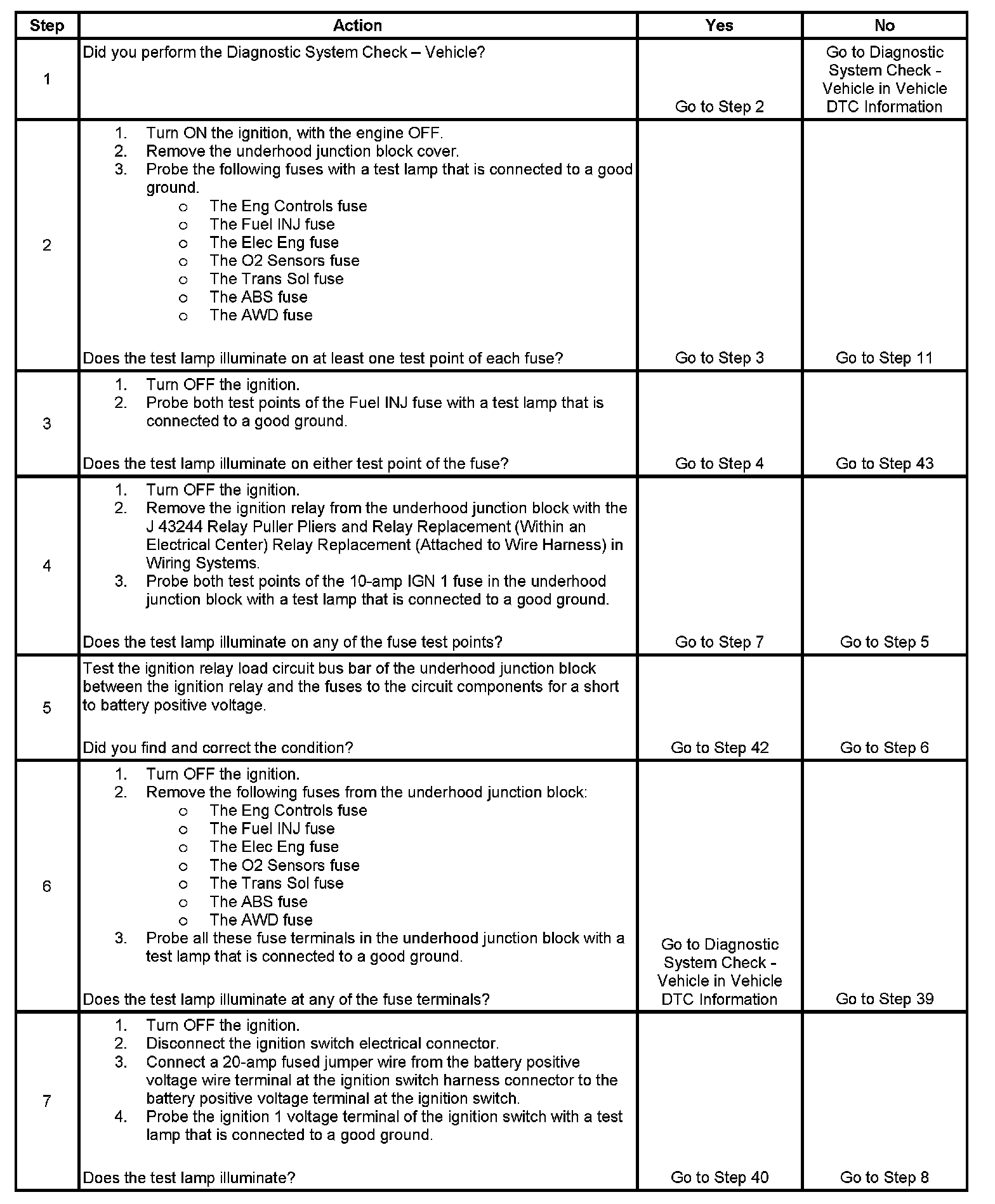 The ignition relay table assumes that the vehicle battery is fully charged. Refer to Battery Inspection/Test in Starting and Charging. Battery Inspection/Test