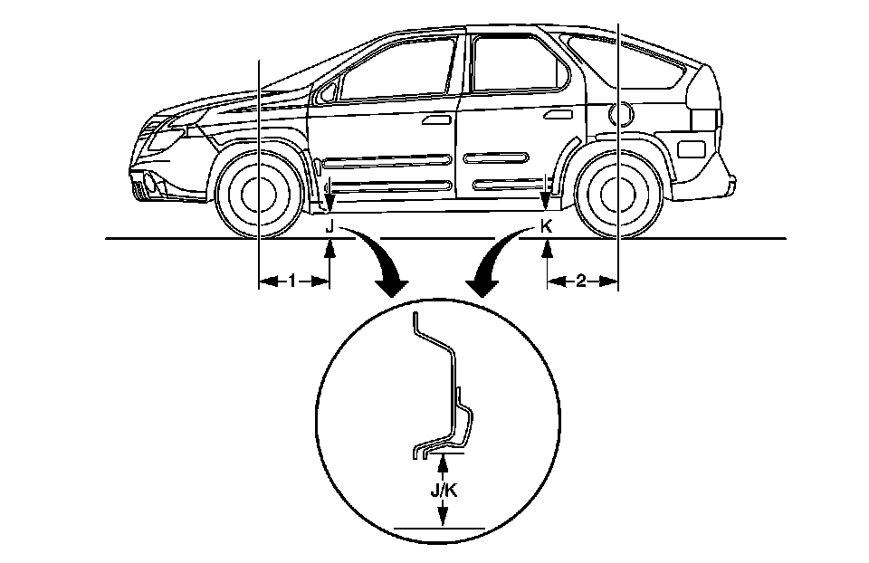 3. Measure the J dimension for the left and right side of the vehicle 604 mm (24 inch) from the centerline of the FRONT wheel (1).