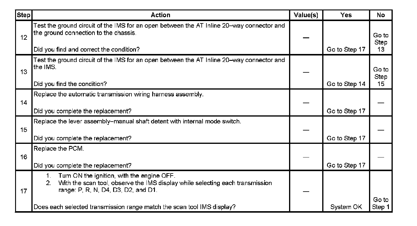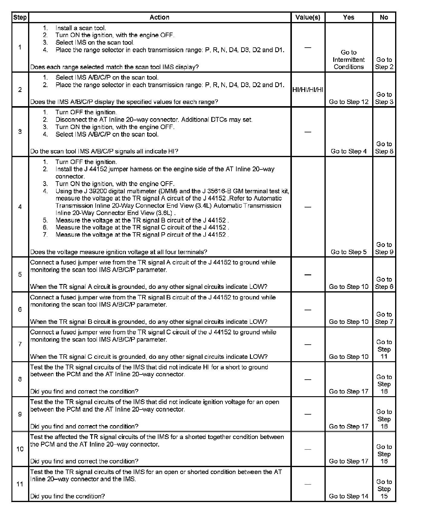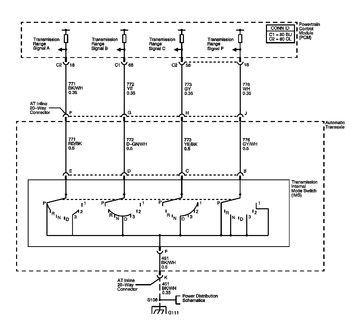 The transmission internal mode switch (IMS) is a sliding contact switch attached to the selector detent inside the transmission side cover. The 4 inputs to the PCM indicate the position of the transmission range selector. The input voltage level at the PCM is high, B+, when the IMS is open and low when the switch is closed to ground. The 4 input parameters represented are Signals A, B, C and P, Parity.
