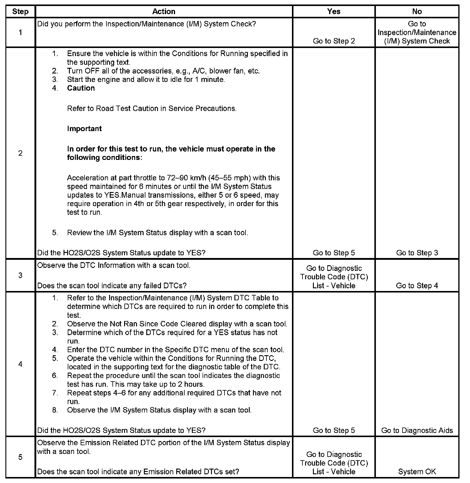 The purpose of this test is to satisfy the enable criteria necessary to execute inspection/maintenance (I/M) readiness diagnostics for the heated oxygen sensor (HO2S)/oxygen sensor (O2S) system. The test may be used to set the I/M System Status to YES. The I/M System Status display on the scan tool provides an indication of whether the control module has completed the required test. The required test is complete when either all of the DTCs comprising the test have run and passed, or when any one of the DTCs comprising the test has illuminated the malfunction indicator lamp (MIL). Once the test is complete, the I/M System Status display will indicate YES in the Completed column.