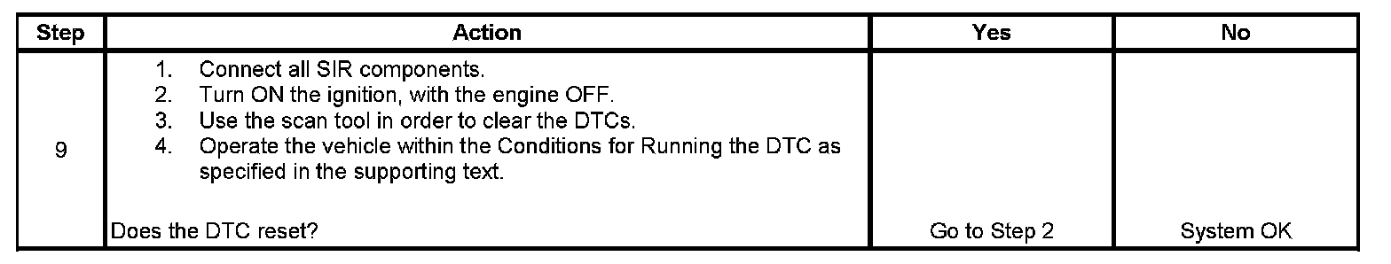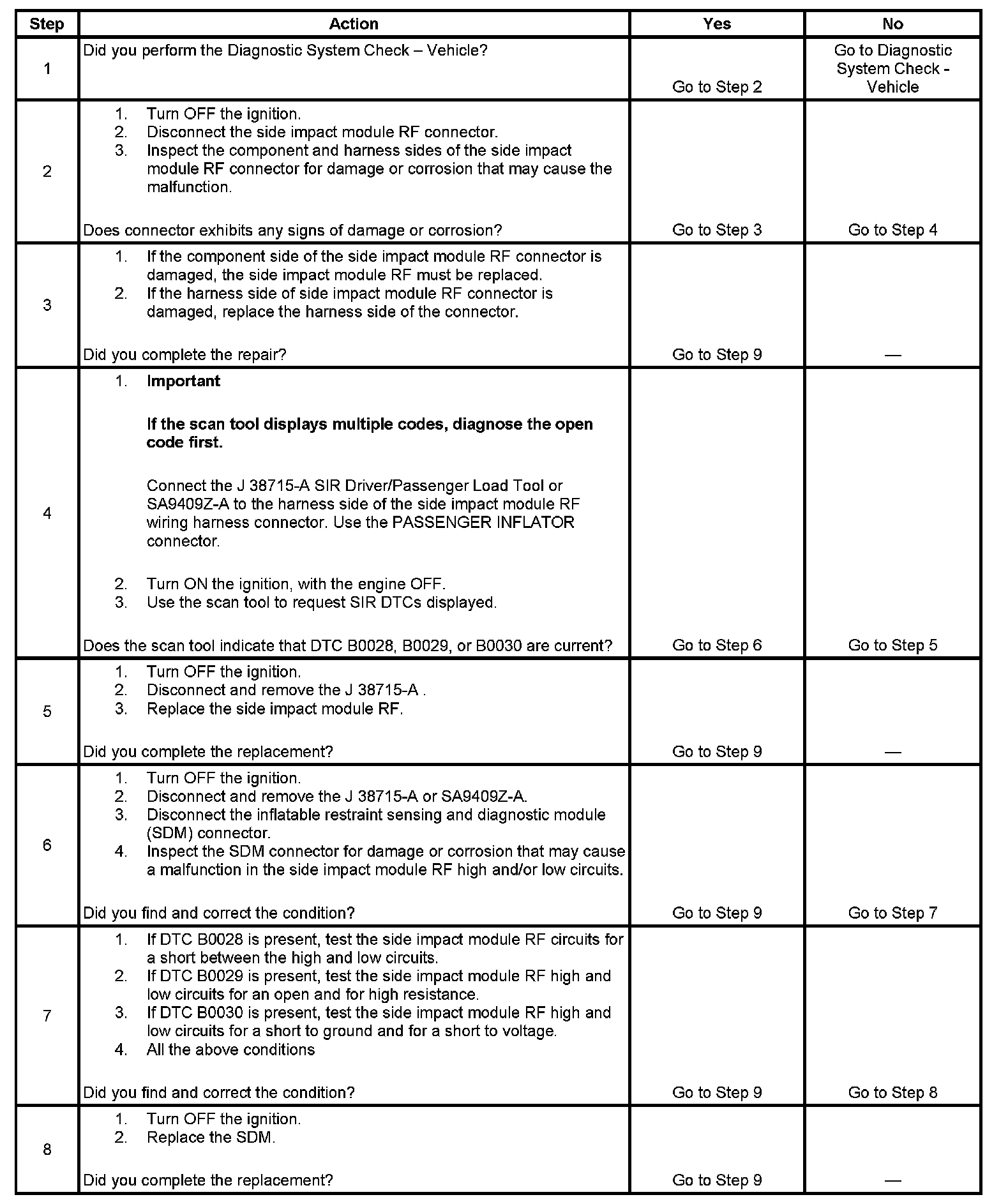 7. This step tests to see what DTCs are present. If DTC B0028 s present, test the side impact module RF for a short between high and low circuits. If DTC B0029 is present, test the side impact module RF high and low circuits for an open and for high resistance. If DTC B0030 is present, test the side impact module RF high and low circuits for a short to ground or a short to voltage.