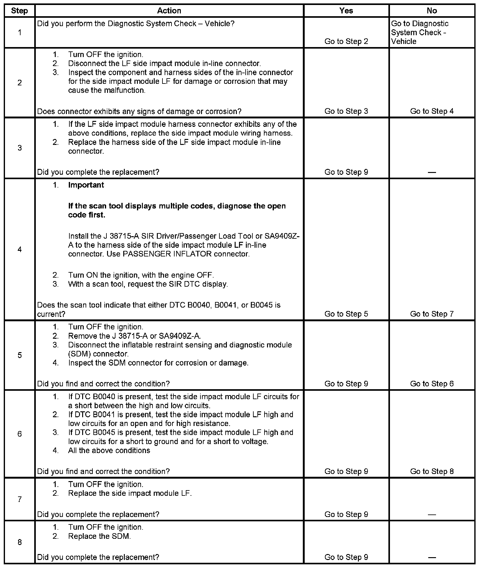 6. This step tests to see what DTCs are present. If DTC B0040 is present, test the side impact module LF for a short between high and low circuits. If DTC B0041 is present, test the side impact module LF high and low circuits for an open and for high resistance. If DTC B0045 is present, test the side impact module LF high and low circuits for a short to ground or a short to voltage.