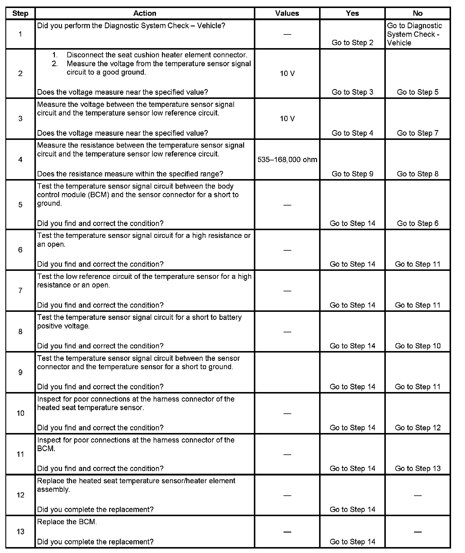 The numbers below refer to the step numbers on the diagnostic table.