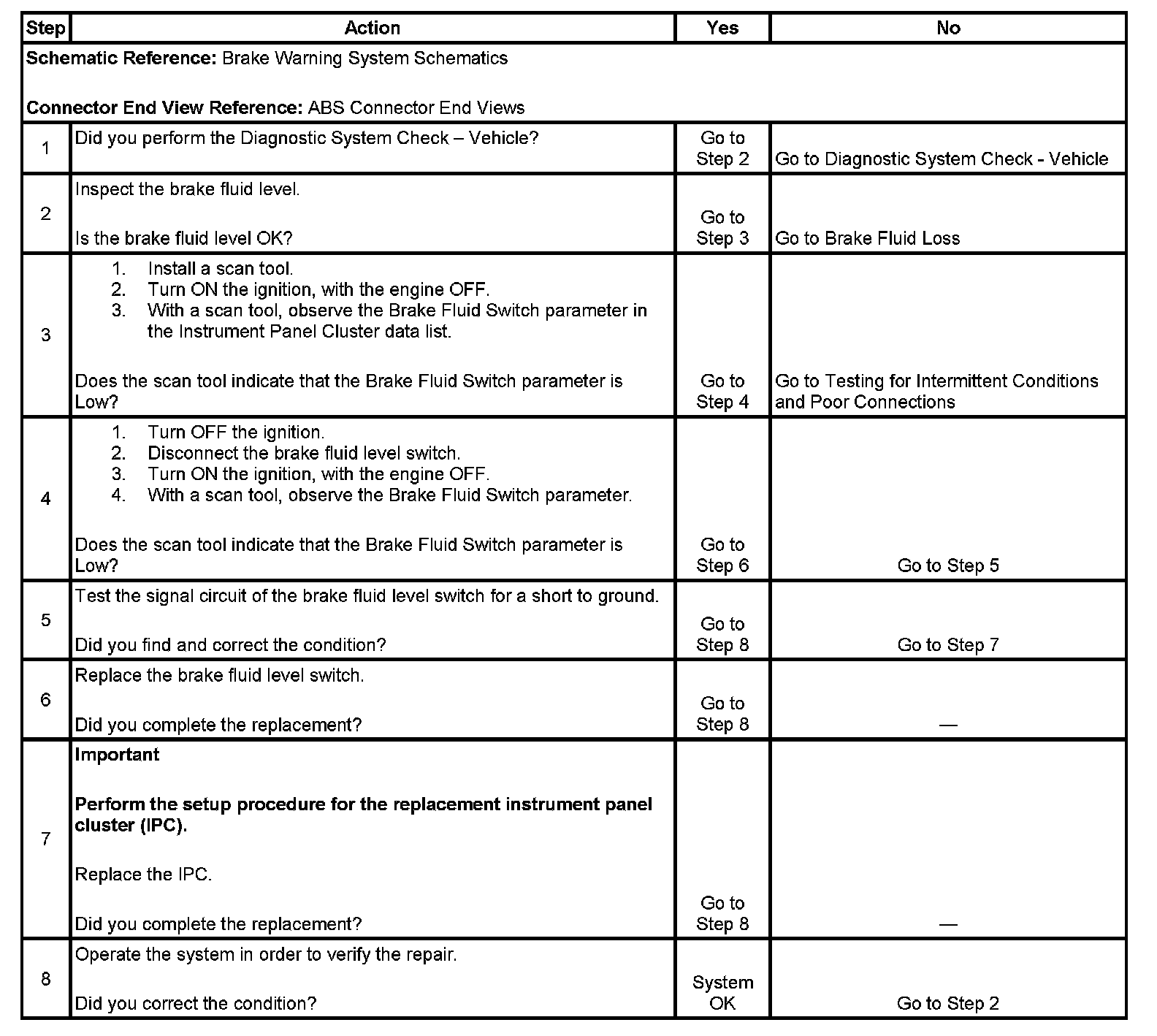 The brake fluid level switch monitors the level of brake fluid in the master cylinder. When the IPC sees the brake fluid level switch input grounded, it turns ON the red Brake indicator and sends a serial data message to the EBCM that tells the EBCM that the brake fluid level is low.