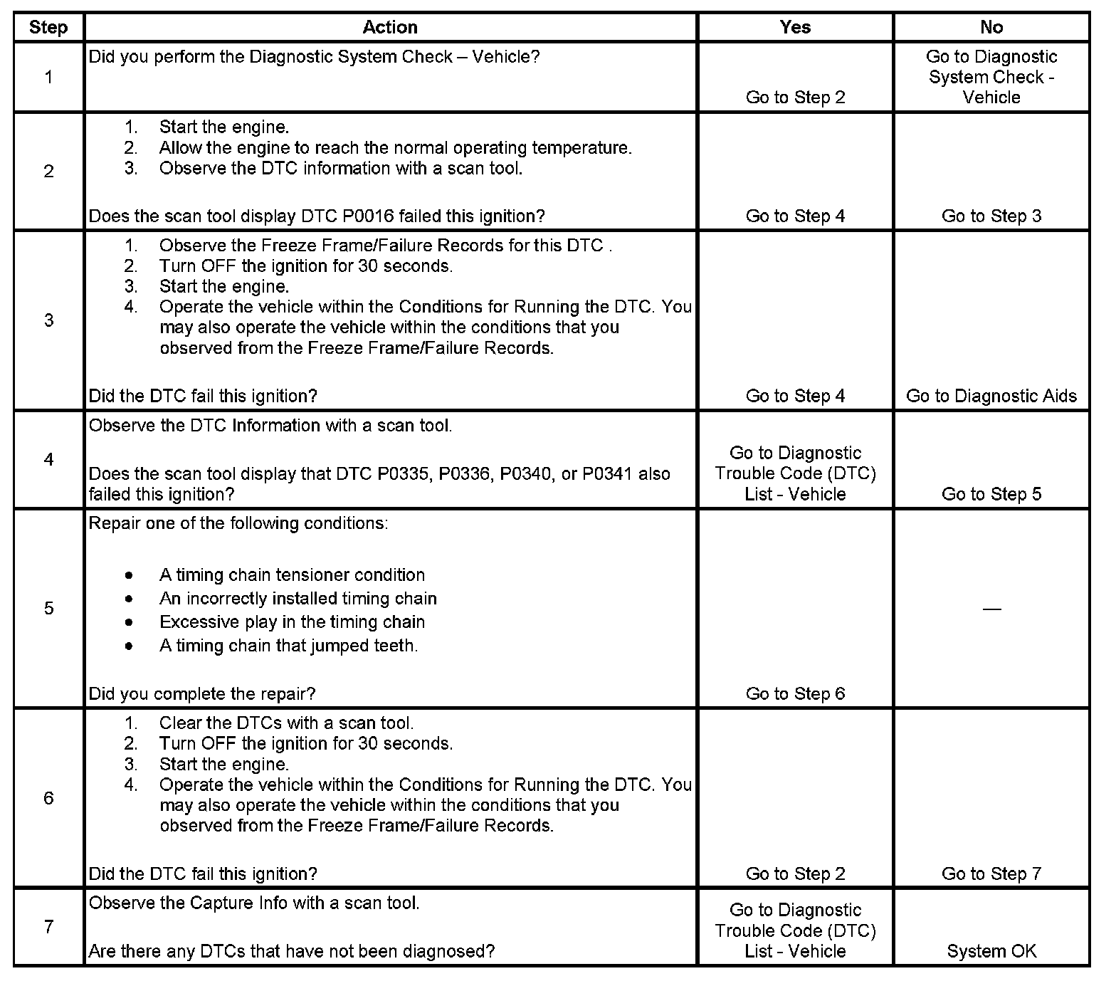 5. This step inspects for any recent engine mechanical repairs. An incorrectly installed camshaft, crankshaft, or timing chain can cause this DTC to set.