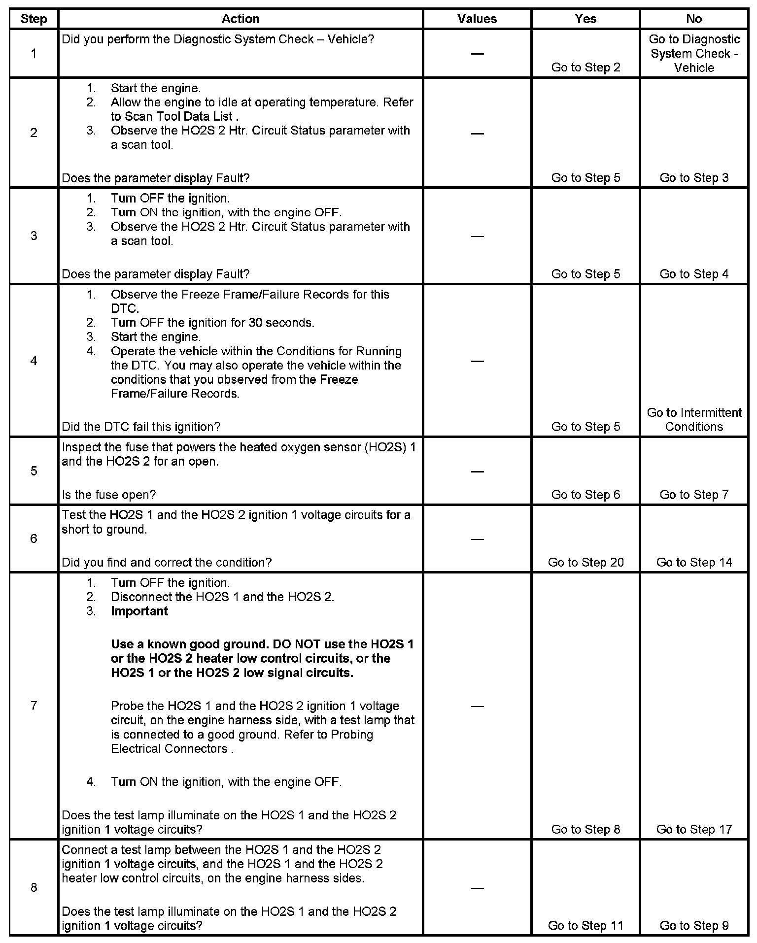The PCM commands the heater ON or OFF to maintain a specific HO2S operating temperature range. The PCM determines the temperature by measuring the current flow through the heater. When the heater is in the ON state, the PCM will pulse the heater OFF for a duration of 50 ms, once per second. when the heater is in the OFF state, the PCM will pulse the heater ON for a duration of 50 ms, once per second.