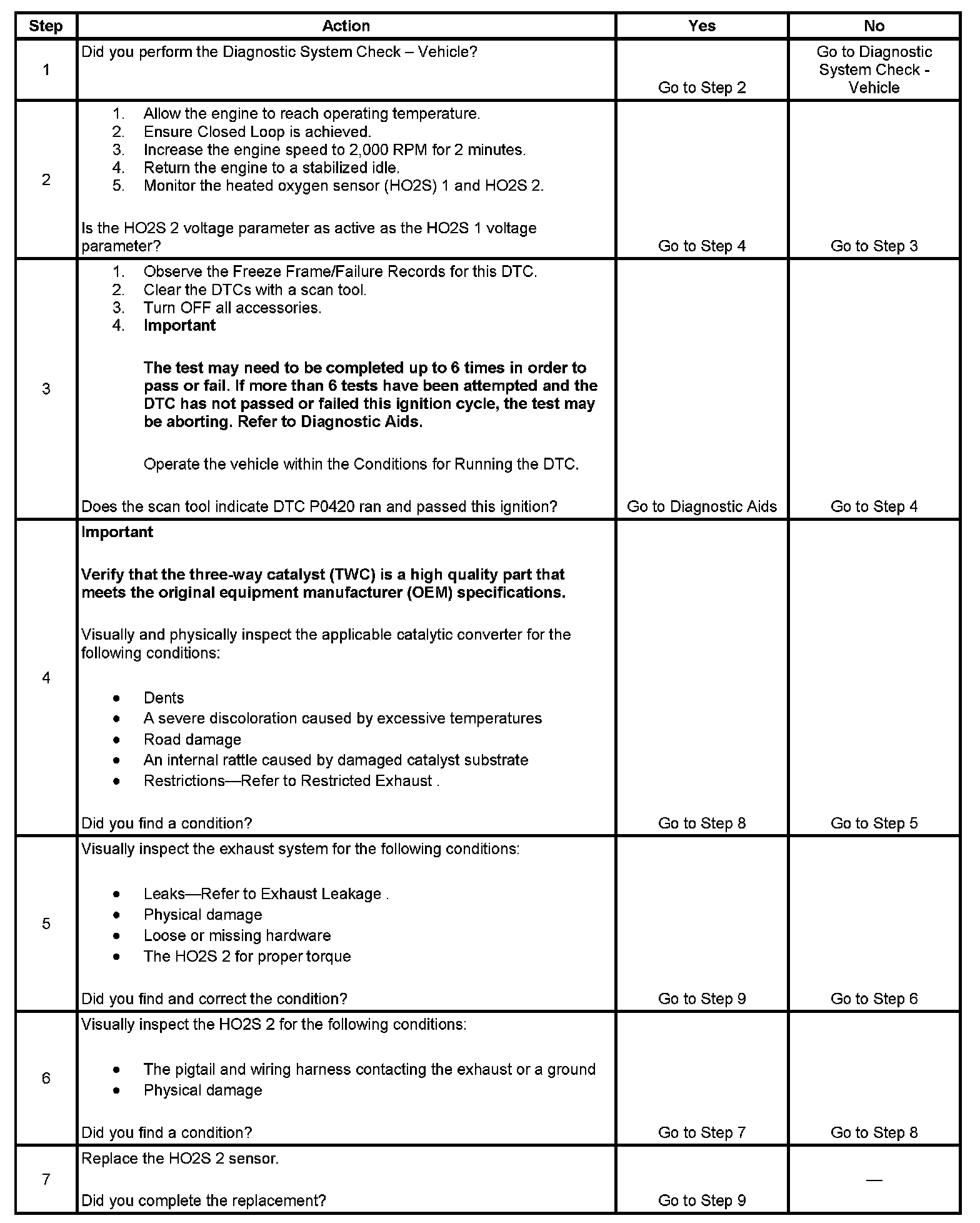 A three-way catalytic converter (TWC) controls emissions of hydrocarbons (HC), carbon monoxide (CO), and oxides of nitrogen (NOx). The catalyst within the converter promotes a chemical reaction which oxidizes the HC and the CO that are present in the exhaust gas. This process converts the HC and the CO into water vapor and carbon dioxide (CO2), and reduces the NOx, converting the NOx into nitrogen. The catalytic converter also stores oxygen. The powertrain control module (PCM) monitors this process by using a heated oxygen sensor (HO2S) that is in the exhaust stream after the TWC. This HO2S 2, also referred to as the catalyst monitor sensor, produces an output signal that the PCM uses to calculate the oxygen storage capacity of the catalyst. This indicates the ability of the catalyst to convert the exhaust emissions efficiently. The PCM monitors the efficiency of the catalyst by allowing the catalyst to heat, then wait for a stabilization period while the engine is idling. The PCM then adds and removes fuel while monitoring the HO2S 2. When the catalyst is functioning properly, the HO2S 2 response to the extra fuel is slow compared to the response of the HO2S 1, which is located before the TWC. When the HO2S 2 response is near that of the HO2S 1, the oxygen storage capability and efficiency of the catalyst may be degraded below an acceptable threshold. If the PCM detects the degraded condition, DTC P0420 sets.