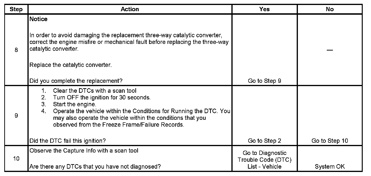 The PCM determines that the efficiency of the catalyst has degraded below a calibrated threshold. This diagnostic may conclude in as few as one test attempt. However, this diagnostic may require as many as 18 test attempts, which would require at least 3 drive cycles. Each test attempt concludes within 2 minutes.