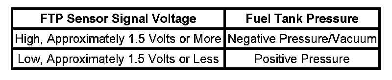 The table illustrates the relationship between the FTP sensor signal voltage and the EVAP system pressure/vacuum.