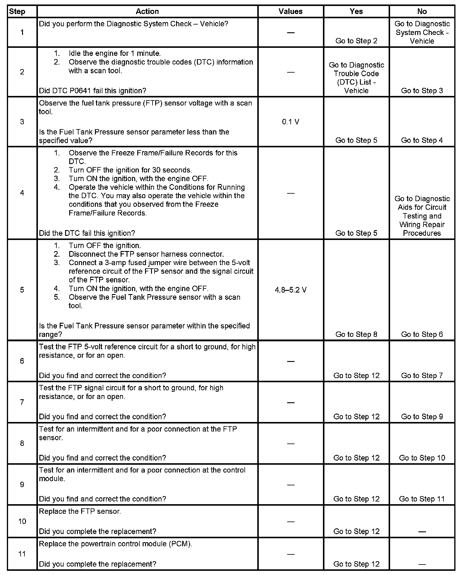 The fuel tank pressure (FTP) sensor measures the difference between the air pressure or vacuum in the evaporative emission (EVAP) system, and the outside air pressure. The control module supplies a 5-volt reference and a low reference circuit to the FTP sensor. The FTP sensor signal circuit voltage varies depending on EVAP system pressure or vacuum. If the FTP sensor signal voltage goes below a calibrated value, this DTC sets.