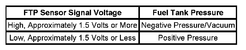 The table illustrates the relationship between FTP sensor signal voltage and the EVAP system pressure/vacuum.