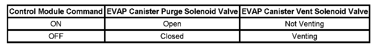 The table illustrates the relationship between the ON and OFF states, and the Venting or Not Venting states of the EVAP canister purge and vent solenoid valves.