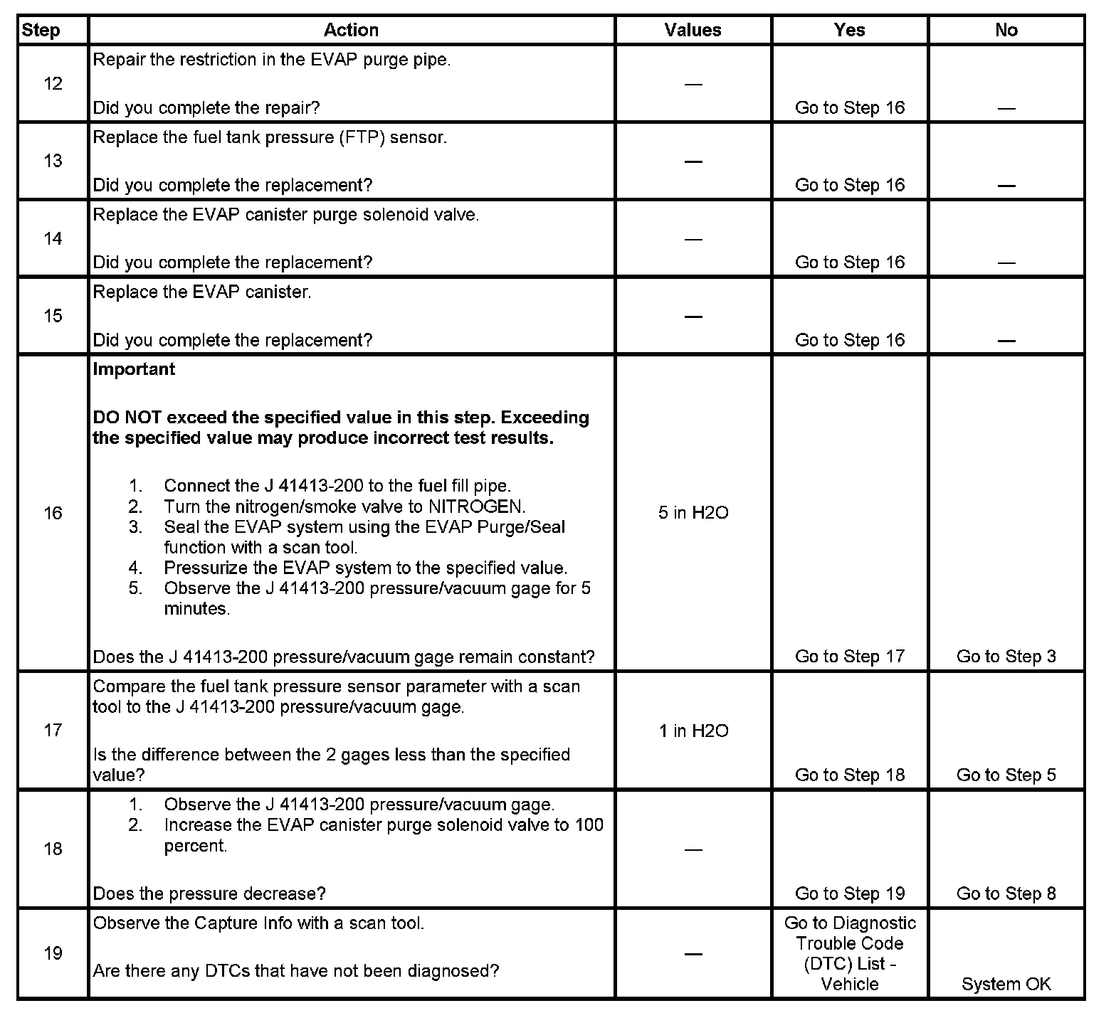 The control module tests the evaporative emission (EVAP) system for a large leak. The control module monitors the fuel tank pressure (FTP) sensor signal to determine the EVAP system vacuum level. When the conditions for running are met, the control module commands the EVAP canister purge solenoid valve OPEN and the EVAP canister vent solenoid valve CLOSED. This allows engine vacuum to enter the EVAP system. At a calibrated time, or vacuum level, the control module commands the EVAP canister purge solenoid valve closed, sealing the system, and monitors the FTP sensor input in order to determine the EVAP system vacuum level. If the system is unable to achieve the calibrated vacuum level, or if the vacuum level decreases too rapidly, this DTC sets.
