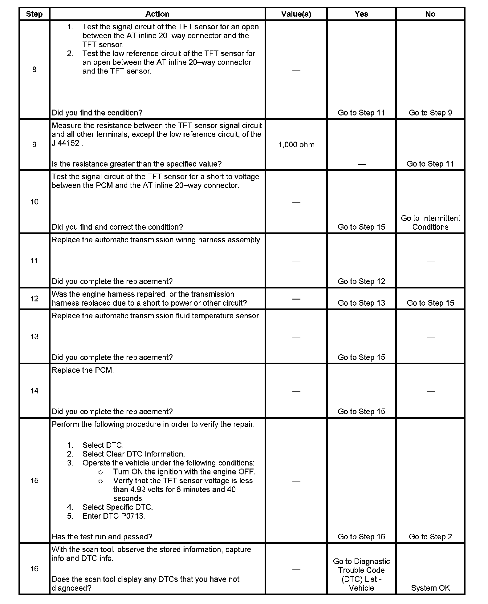 If the PCM detects a continuous open or a short to voltage on the TFT sensor circuit, then DTC P0713 sets. DTC P0713 is a type C DTC.