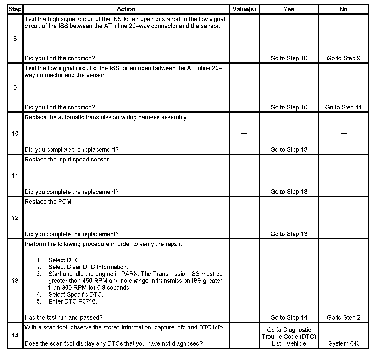 If the PCM detects an unrealistically large change in the ISS sensor high signal in a short period of time, then DTC P0716 sets. DTC P0716 is a type B DTC.