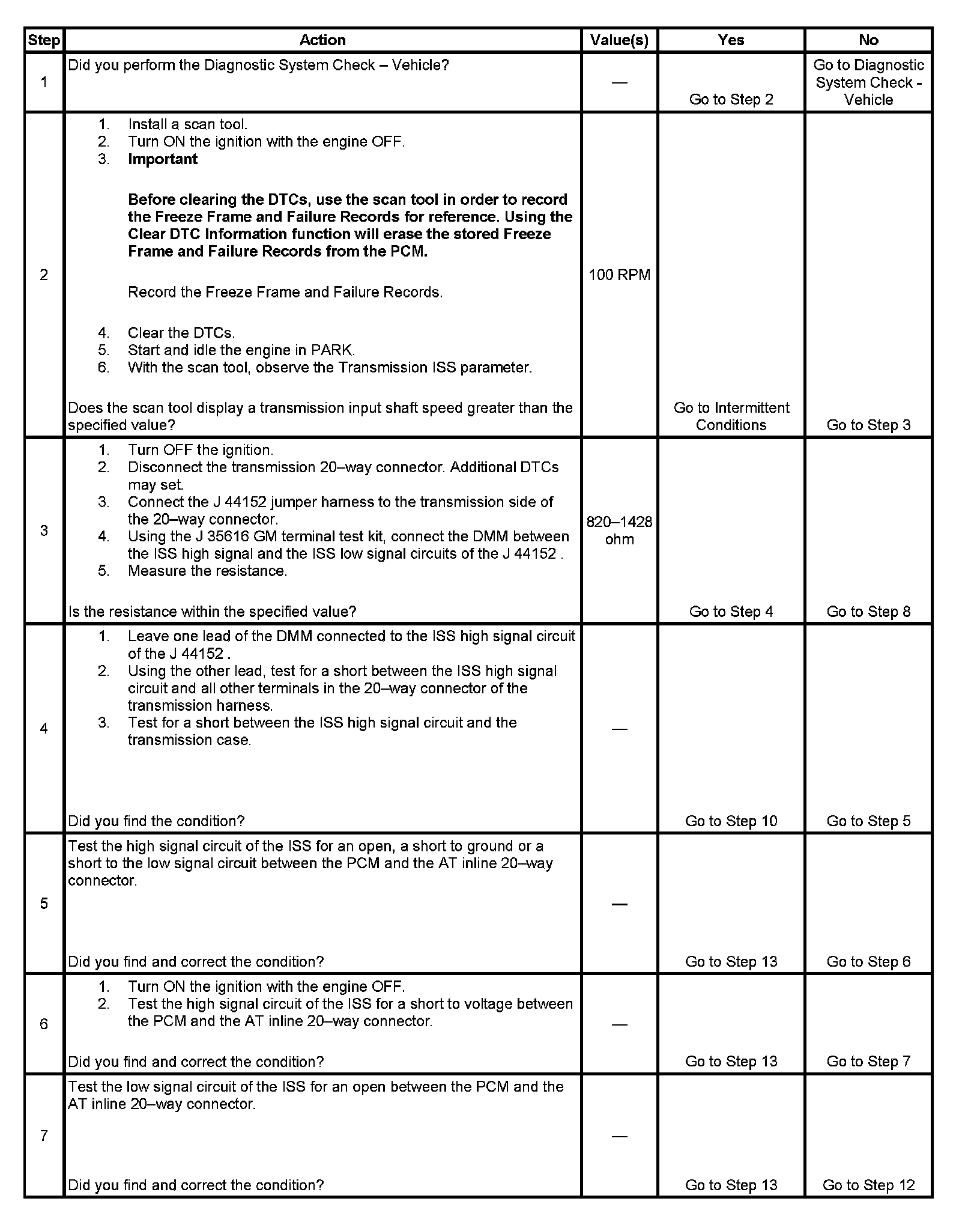 The numbers below refer to the step numbers on the diagnostic table.