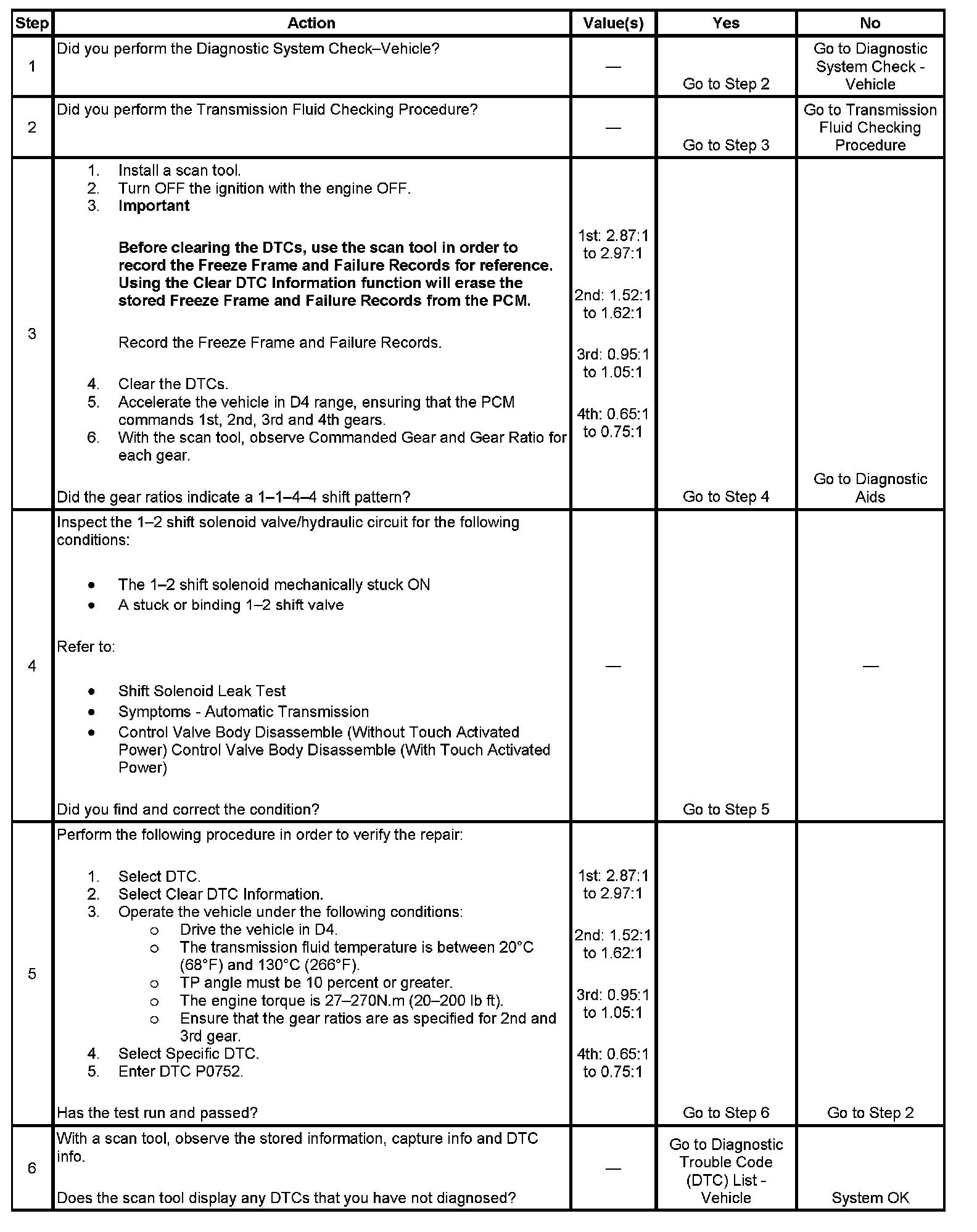 If the PCM detects a 1st gear ratio when 2nd gear is commanded and a 4th gear ratio when 3rd gear is commanded, then DTC P0752 sets. DTC P0752 is a type B DTC.