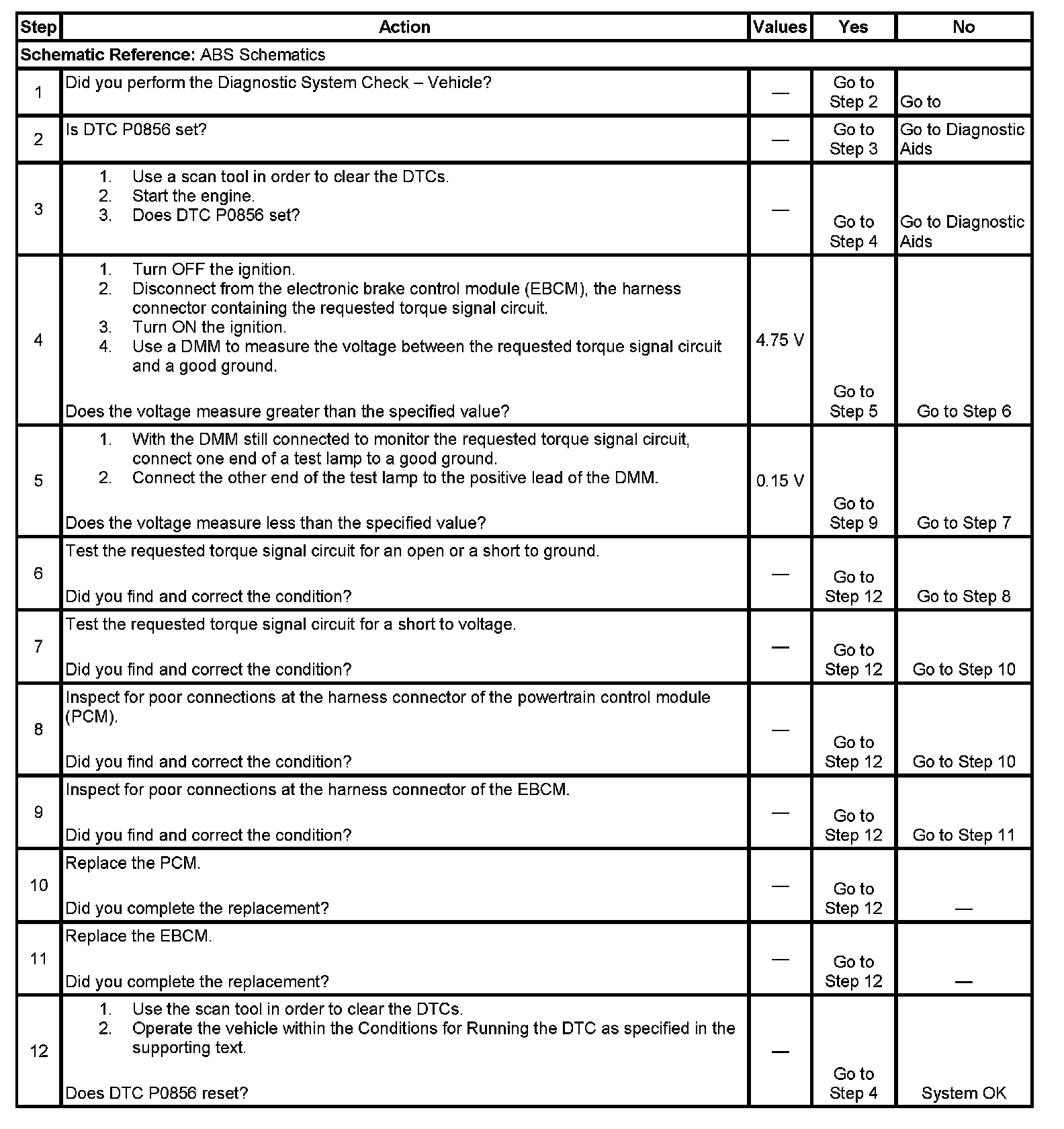 The electronic brake control module (EBCM) and the powertrain control module (PCM) simultaneously control the Traction Control System (TCS). The EBCM sends a Requested Torque message via a pulse width modulated (PWM) signal to the PCM. The duty cycle of the signal is used to determine how much engine torque the EBCM is requesting the PCM to deliver. Normal values are between 10 and 90 percent duty cycle. The signal should be at 90 percent when traction control is not active and at lower values during traction control activations. The PCM supplies the pull up voltage that the EBCM switches to ground to create the signal.