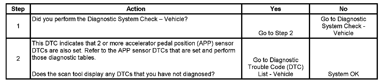 The control module provides the APP sensors a 5-volt reference circuit and a low reference circuit. The APP sensors then provide the control module signal voltages proportional to pedal movement. The APP sensor 1 signal voltage is low at rest and increases as the pedal is depressed. The APP sensor 2 signal voltage is also low at rest and increases as the pedal is depressed. One APP sensor DTC will not cause the Reduced Engine Power message to be displayed. Two APP sensor DTCs for the same sensor also will not cause the Reduced Engine Power message to be displayed. However, if two or more DTCs are set involving more than one APP sensor, DTC P1125 will set.