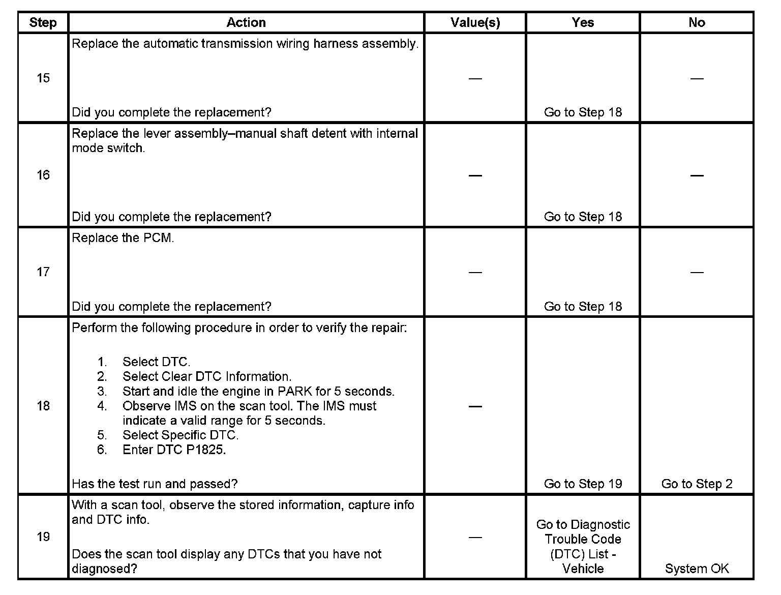 If the PCM detects an invalid transmission range with the engine running, then DTC P1825 sets. DTC P1825 is a type C DTC.