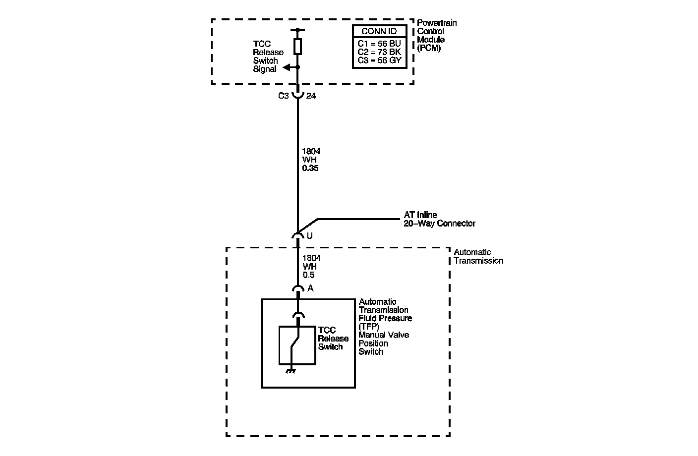 The TCC release switch is part of the transmission fluid pressure (TFP) manual valve position switch. The TFP manual valve position switch is mounted to the transmission valve body. The TCC release switch is normally-closed.