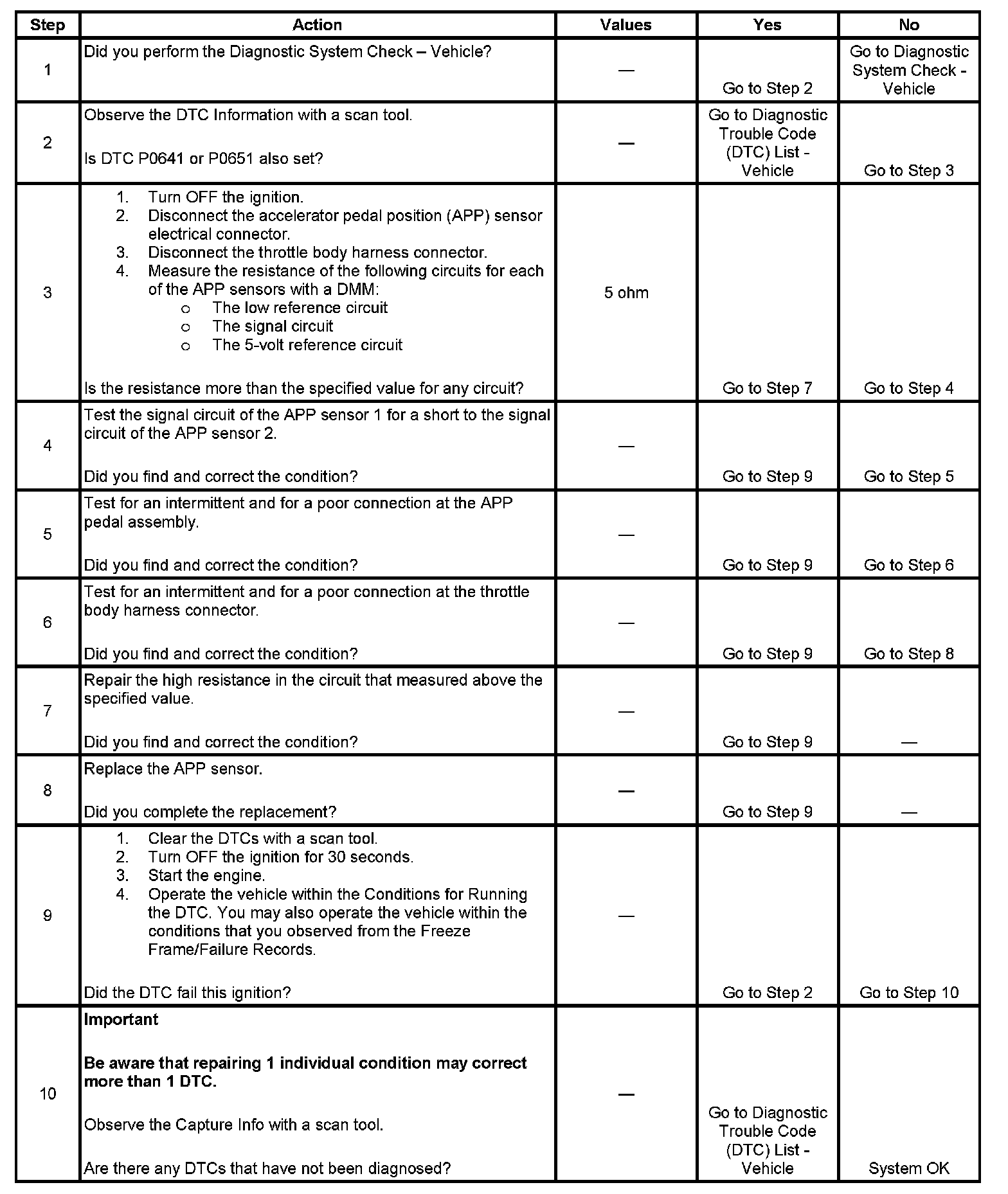 The control module provides the APP sensors a 5-volt reference circuit and a low reference circuit. The APP sensors then provide the control module signal voltages proportional to pedal movement. The APP sensor 1 and the APP sensor 2 signal voltages are both low at rest and increase as the pedal is depressed. When the control module detects that the APP sensor 1 and the APP sensor 2 signal circuits are out of correlation, DTC P2138 sets.