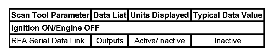 The Keyless Entry Scan Tool Data List contains all of the keyless entry related parameters that are available on the scan tool. The parameters in the list are arranged in alphabetical order. The column, "Data List," indicates the location of the parameter within the scan tool menu selections. Use the Keyless Entry Scan Tool Data List as directed by a diagnostic table or in order to supplement the diagnostic procedures. Begin all of the diagnostic procedures with Diagnostic System Check - Vehicle. Diagnostic System Check - Vehicle