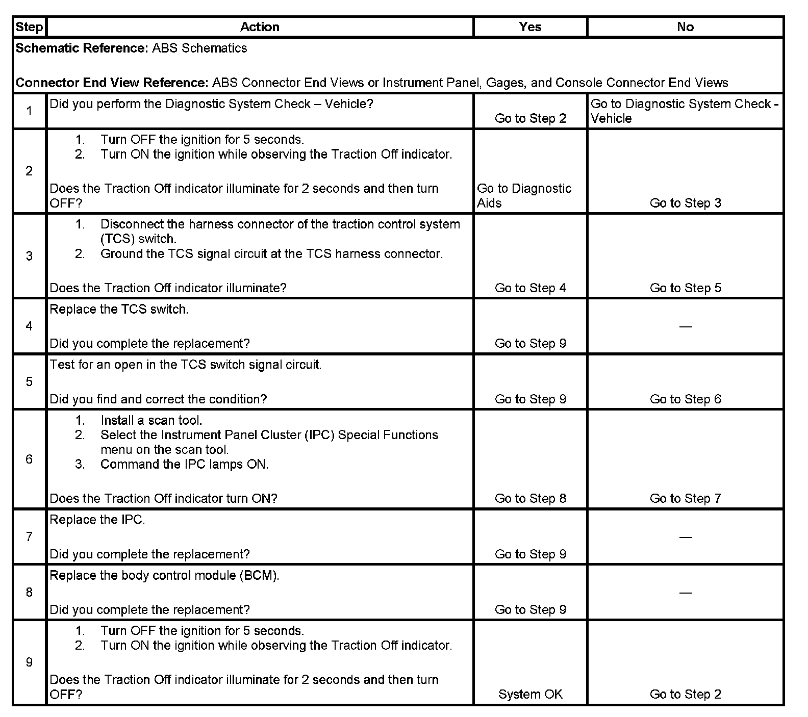 6. This step tests if the instrument panel cluster (IPC) is able to turn ON the Traction Off indicator.