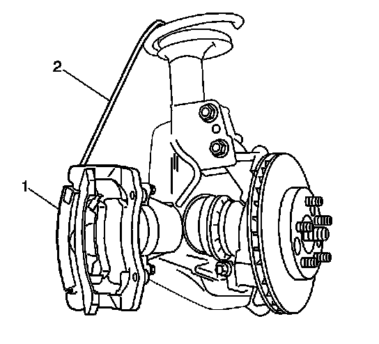 Remove the caliper bracket bolts. Do not disconnect the brake flexible hose bolt. Remove the brake caliper and the caliper mounting bracket as an assembly (1) from the suspension knuckle and support the assembly with heavy mechanic's wire (2), or equivalent. Ensure that there is no tension on the hydraulic brake flexible hose.