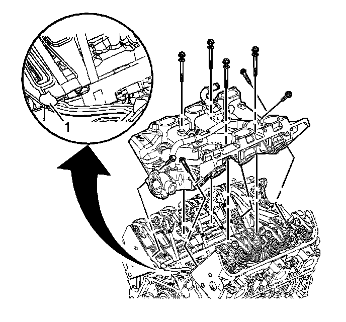 3. With gaskets and seals in place apply a small drop 8-10 mm (0.31-0.39 inch) of RTV sealer GM P/N 12378521 (Canadian P/N 88901148), or equivalent, to the 4 corners of the intake manifold to block joints (1).