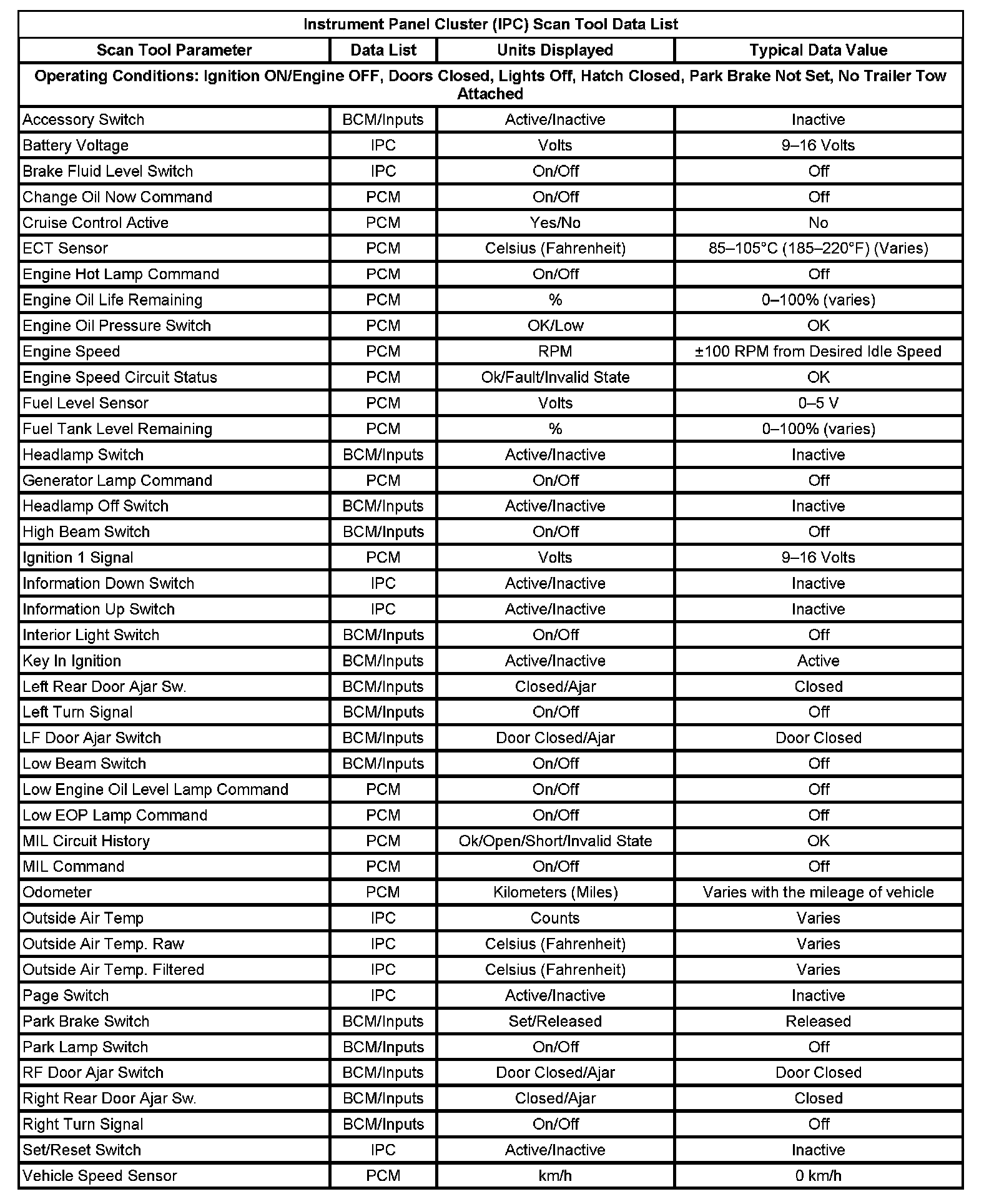 Instrument Panel Cluster (IPC) Scan Tool Data List: