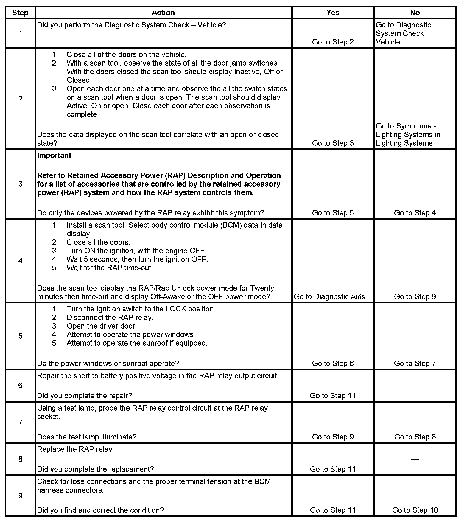 This table is used for all retained accessory power (RAP) relay and RAP serial data controlled accessories which remain active after RAP has timed out. The RAP relay system can malfunction separately from the serial data controlled RAP system and the serial data controlled RAP system can malfunction separately from the RAP relay. If multiple accessories are not exhibiting an "On After Time-out" symptom, either on the RAP relay controlled circuit or the serial data controlled circuit or both, the malfunction is in a particular device and not in the RAP control system. Refer to Control Module References to locate information on a specific system. Control Module References