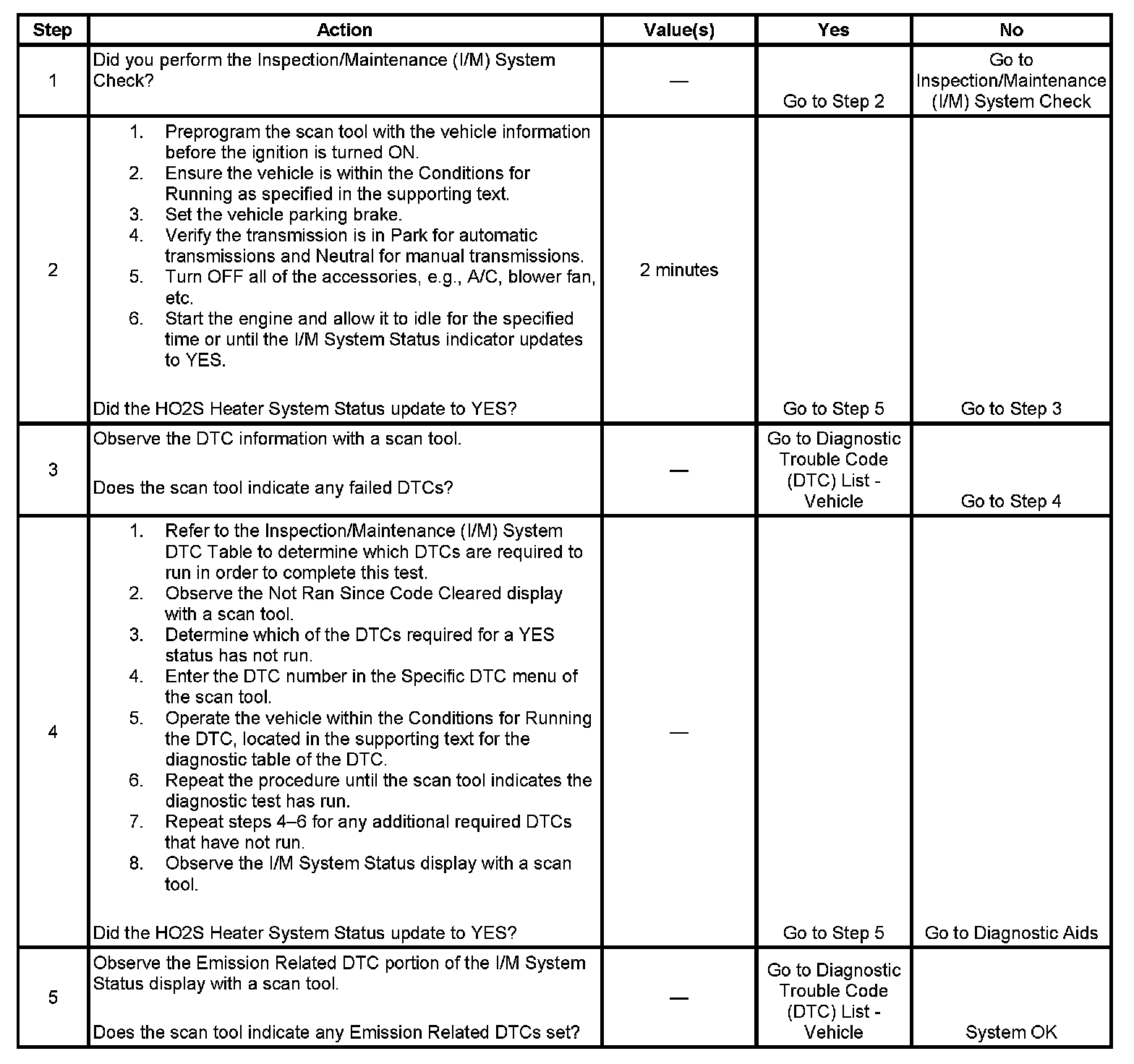 The purpose of this test is to satisfy the enable criteria necessary to execute inspection/maintenance (I/M) readiness diagnostics for the heated oxygen sensor (HO2S) system. The test may be used to set the I/M System Status to YES. The I/M System Status display on the scan tool provides an indication of whether the control module has completed the required tests. The I/M System Status does not indicate that the tests have passed or failed. When all of the diagnostics for a specific system have run and passed, the I/M System Status will update to YES. If a test for a specific system has failed, the I/M System Status will update to YES, indicating a determination was made, even if all of the other tests for that system have not run.