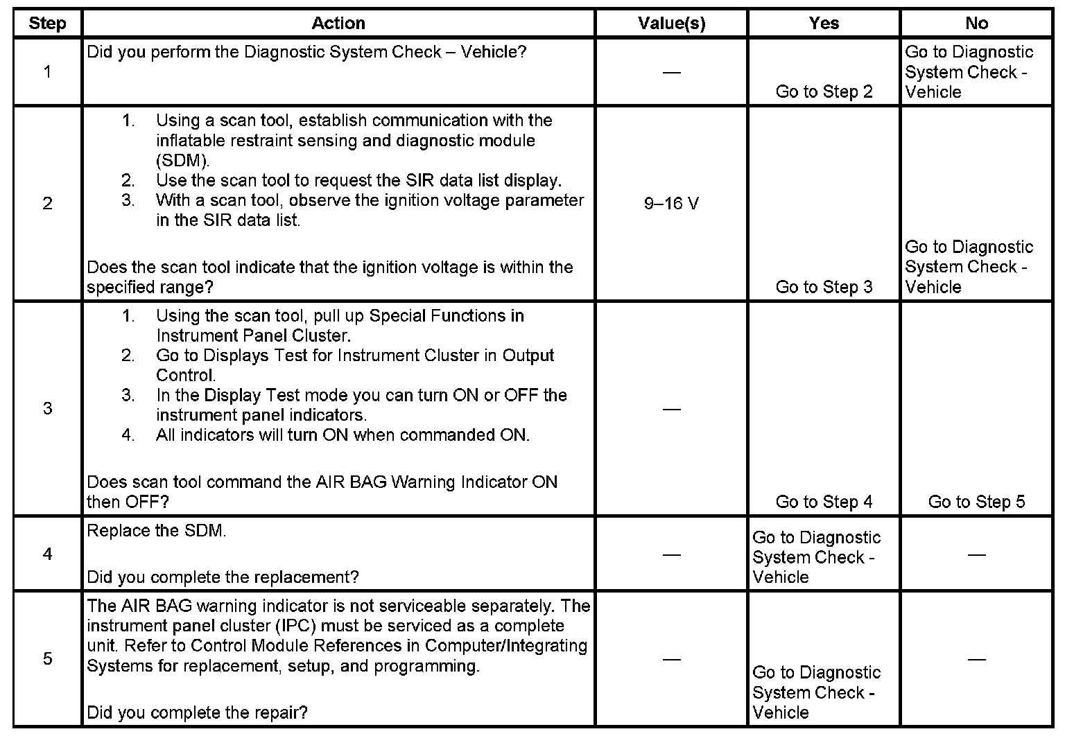 The ignition switch supplies ignition voltage to the inflatable restraint sensing and diagnostic module (SDM) using the SIR Fuse. The ignition switch also supplies ignition 1 voltage to the instrument panel cluster (IPC). The AIR BAG warning indicator is controlled by the SDM via class 2 serial data. When the ignition switch is first turned ON, the SDM responds by performing tests on the SIR system and commanding the AIR BAG warning indicator OFF, after it has flashed 7 times, if no trouble codes (DTCs) are found.